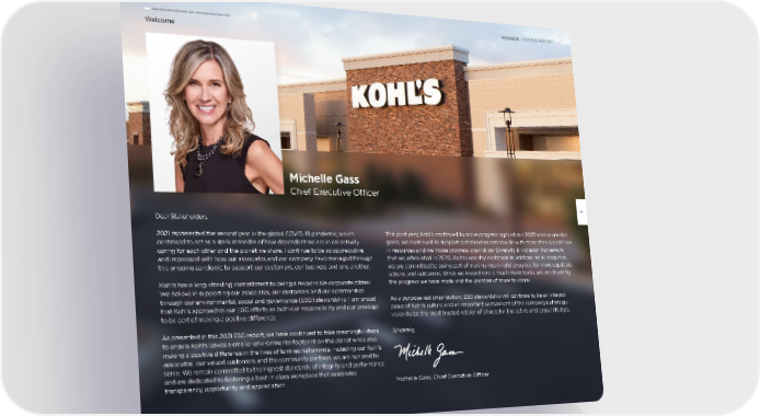Welcome Michelle Gass Chief Executive Officer 2021 ESG REPORT This past year, Kohl’s continued to make progress against our 2025 environmental goals, we continued to support communities nationwide with more than $30 million in resources and we made progress against our Diversity & Inclusion framework that we articulated in 2020. As the country continues to address racial inequities, we are committed to being part of making meaningful progress for more equitable actions and outcomes. While we know there is much more to do, we are driven by the progress we have made and the promise of more to come. As a purpose-led organization, ESG stewardship will continue to be an integral piece of Kohl’s culture and an important component of the company’s strategic vision to be the most trusted retailer of choice for the active and casual lifestyle. Sincerely, Dear Stakeholders, 2021 represented the second year in the global COVID-19 pandemic, which continued to act as a stark reminder of how dependent we are in collectively caring for each other and the planet we share. I continue to be so appreciative and impressed with how our associates and our company have managed through this ongoing pandemic to support our customers, our business and one another. Kohl’s has a long-standing commitment to being a responsible corporate citizen. We believe in supporting our associates, our customers and our communities through our environmental, social and governance (ESG) stewardship. I am proud that Kohl’s approaches our ESG efforts as both our responsibility and our privilege to be part of making a positive difference. As presented in this 2021 ESG report, we have continued to take meaningful steps to ensure Kohl’s leaves a smaller environmental footprint on the planet while also making a positive difference in the lives of families nationwide, including our Kohl’s associates, our valued customers and the community partners we are honored to serve. We remain committed to the highest standards of integrity and performance and are dedicated to fostering a best-in-class workplace that celebrates transparency, opportunity and appreciation. Michelle Gass, Chief Executive Officer 3