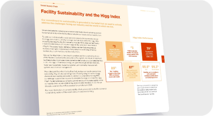 Facility Sustainability and the Higg Index Our commitment to sustainability is grounded in the belief that we need to actively address the challenges facing our industry and the world in which we live. Social Supply Chain 62 2021 ESG REPORT We are dedicated to reducing our environmental footprint and upholding workers’ fundamental rights within the facilities producing our goods and our supply chain. To assist us in driving facility social and environmental improvements, we use the Higg Index. Kohl’s currently leverages multiple tools within the Higg Index, including the Higg Facility Environmental Module (FEM), Higg Verified Facility Environmental Module (VFEM) and Higg Facility Social and Labor Module (FSLM). This suite of tools delivers a holistic overview that empowers us to make meaningful improvements that protect the well-being of factory workers, local communities and the environment. We use the Higg Index to benchmark ourselves and the sustainability efforts of the facilities involved in the production of our goods. We require all approved facilities producing private and exclusive branded products to complete the Higg FEM. The Higg FEM assesses energy use, greenhouse gas and air emissions, water use, wastewater, waste management, environmental management systems and chemical management. We understand that when the facilities that produce our goods operate more sustainably, they are also operating more efficiently using less water, energy, chemicals and creating less waste. In addition to completing the Higg FEM, our strategic suppliers are required to complete the Higg VFEM and the Higg FSLM. To demonstrate our ongoing commitment to driving sustainability within our supply chain, we are establishing environmental standards in 2022 for our strategic suppliers that will be assessed for compliance in 2023. For more information on our sustainability efforts, please refer to the Environmental Sustainability section of this report and our Environmental Policy. * Facilities out of compliance were imported on the vendor scorecard. ** Data obtained from Higg, Trusted Sustainability Data Higg Index Performance # 3 Highest absolute number of received posted FEM 2020 self-assessment modules # 3 Highest absolute number of received posted verified FEM 2020 modules 39 % Average score performance improvement against 2018 89 % Tier 1 facilities completed the Higg FEM and shared results with Kohl’s 61 %* Tier 2 and beyond facilities completed the Higg FEM and shared results with Kohl’s Facilities are in compliance with wastewater discharge permits and/or contractual agreement 98.9 % Tier 1 99.3 % Tier 2 & beyond One key component is comparing year-to-year results to determine if progress is being made. Kohl’s has a total of 1195 Tier 1 and 829 Tier 2 and beyond facilities.