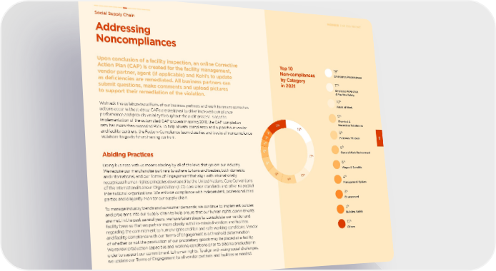 Addressing Noncompliances Social Supply Chain 60 2021 ESG REPORT We track the collaborative efforts of our business partners and work to ensure corrective actions occur without delay. CAPs are designed to drive improved compliance performance and provide visibility throughout the audit process. Since the implementation of the automated CAP process in spring 2018, the CAP completion rate has more than exceeded 95%. To help elevate compliance and support our vendor and facility partners, the Factory Compliance team classifies and tracks all noncompliance violations to guide future training content. Abiding Practices Doing business with us means abiding by all of the laws that govern our industry. We require our merchandise partners to adhere to laws and treaties, both domestic and international, and our Terms of Engagement that align with internationally recognized human rights principles developed by the United Nations, Core Conventions of the International Labour Organization (ILO) core labor standards and other respected international organizations. We enforce compliance with independent, professional third parties and diligently monitor our supply chain. To manage industry trends and consumer demands, we continue to implement policies and programs into our supply chain to help ensure that our human rights commitments are met. In the past several years, we have taken steps to consolidate our vendor and facility base so that we partner more closely with like-minded vendors and facilities regarding the commitment to human rights and fair and safe working conditions. Vendor and facility compliance with our Terms of Engagement is a threshold determination of whether or not the production of our proprietary goods may be placed at a facility. We review production capacities and working conditions prior to placing production in order to support our commitment to human rights. To align with rising social challenges, we update our Terms of Engagement to all vendor partners and facilities as needed. Upon conclusion of a facility inspection, an online Corrective Action Plan (CAP) is created for the facility management, vendor partner, agent (if applicable) and Kohl’s to update as deficiencies are remediated. All business partners can submit questions, make comments and upload pictures to support their remediation of the violation. Top 10 Non-compliances by Category in 2021 19 % Emergency Preparedness 17 % Employee Protection & Machine Safety 10 % Hours of Work 9 % Chemical & Hazardous Substances 9 % First Aid / Medical 8 % General Work Environment 6 % Wages & Benefits 4 % Management System 3 % Environment 3 % Building Safety 12 % Others 3 % 3 % 4 % 6 % 8 % 9 % 9 % 10 % 17 % 19 % 12 %