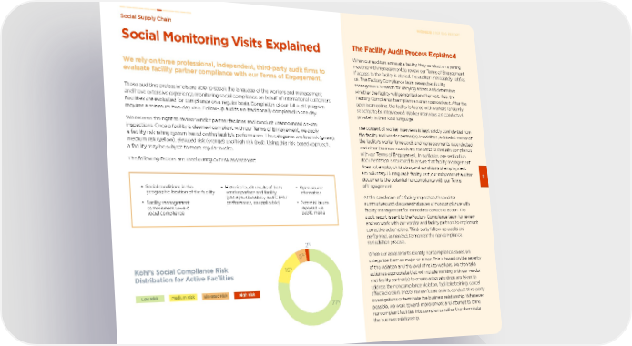 Social Monitoring Visits Explained We rely on three professional, independent, third-party audit firms to evaluate facility partner compliance with our Terms of Engagement. Social Supply Chain 59 2021 ESG REPORT These auditing professionals are able to speak the language of the workers and management and have extensive experience monitoring social compliance on behalf of international customers. Facilities are evaluated for compliance on a regular basis. Completion of our full audit program requires a minimum two-day visit. Follow-up audits are traditionally completed in one day. We reserve the right to review vendor partner facilities and conduct unannounced on-site inspections. Once a facility is deemed compliant with our Terms of Engagement, we apply a facility risk rating system based on the facility’s performance. The categories are low risk (green), medium risk (yellow), elevated risk (orange) and high risk (red). Using this risk-based approach, a facility may be subject to more regular audits. The following factors are used during our risk assessment: • Social conditions in the geographic location of the facility • Facility management commitment toward social compliance • Historical audit results of both vendor partner and facility (social, sustainability and CTPAT performance, as applicable) • Open-source information • Potential issues reported via public media The Facility Audit Process Explained When our auditors arrive at a facility, they conduct an opening meeting with management to review our Terms of Engagement. If access to the facility is denied, the auditor immediately notifies us. The Factory Compliance team researches facility management’s reason for denying access and determines whether the facility will be granted another visit. If so, the Factory Compliance team plans an unannounced visit. After the opening meeting, the facility is toured with workers randomly selected to be interviewed. Worker interviews are conducted privately in their local language. The content of worker interviews is kept strictly confidential from the facility and vendor partner(s). In addition, a detailed review of the facility’s worker time cards and wage payments is conducted and other business records are reviewed to evaluate compliance with our Terms of Engagement. In particular, age verification documentation is reviewed to ensure that facility management does not employ child labor, and conditions of employment are voluntary. During each facility visit, our independent auditor documents the potential noncompliance with our Terms of Engagement. At the conclusion of a facility inspection, the auditor summarizes and discusses instances of noncompliance with facility management for immediate corrective action. The audit report is sent to the Factory Compliance team for review and we work with our vendor and facility partners to implement corrective action plans. Third-party follow-up audits are performed, as needed, to monitor the noncompliance remediation process. When our assessments identify noncompliance issues, we categorize them as major or minor. This is based on the severity of the violation and the level of risk to workers. We then take action as appropriate that will include working with our vendor and facility partner(s) to ensure adequate steps are taken to address the noncompliance violation, facilitate training, cancel affected orders and/or review future orders, conduct third-party investigations or terminate the business relationship. Whenever possible, we work toward improvement and attempt to bring noncompliant facilities into compliance rather than terminate the business relationship. Kohl’s Social Compliance Risk Distribution for Active Facilities Elevated Risk Medium Risk High Risk 77 % 16 % 5 % 2 % Low Risk