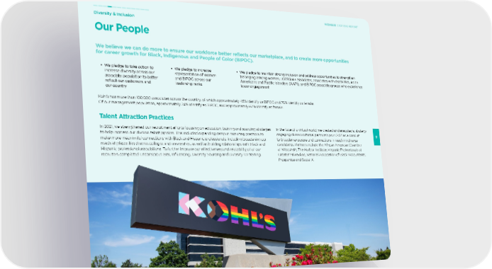 In 2021, we strengthened our recruitment efforts focusing on education, training and sourcing strategies to help increase our diverse talent pipeline. This included expanding campus recruiting practices to make more meaningful connections with Black and Hispanic professionals, including broadening our reach at places like diverse colleges and universities, as well as building relationships with Black and Hispanic professional associations. To further improve our effectiveness and relatability, all of our recruiters completed Unconscious Bias, Influencing, Diversity Sourcing and Diversity 101 training. In the face of a virtual world, we created and executed a strategy engaging diverse external partnerships in 2021 as a conduit to broaden exposure and connections in reaching diverse candidates. Partners include the African American Chamber of Wisconsin, The Harbor Institute, Hispanic Professionals of Greater Milwaukee, National Association of Black Accountants, Prospanica and Social X. Diversity & Inclusion 33 2021 ESG REPORT Our People Talent Attraction Practices We believe we can do more to ensure our workforce better reflects our marketplace, and to create more opportunities for career growth for Black, Indigenous and People of Color (BIPOC). • We pledge to take action to increase diversity across our associate population to better reflect our customers and our country • We pledge to increase representation of women and BIPOC across our leadership ranks • We pledge to maintain strong inclusion and address opportunities to strengthen belonging among women, LGBTQIA+ associates, associates with disabilities, Asian Americans and Pacific Islanders (AAPI), and BIPOC associate groups who experience lower engagement Kohl’s has more than 100,000 associates across the country, of which approximately 43% identify as BIPOC and 76% identify as female. Of our management population, approximately 24% identify as BIPOC, and approximately 62% identify as female. 2021 ESG REPORT
