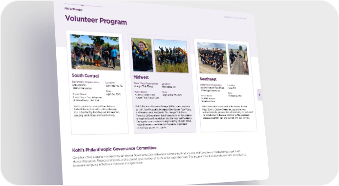 Volunteer Program Philanthropy 55 2021 ESG REPORT Kohl’s Business Resource Groups (BRGs) came together to fight food insecurity by supporting Hunger Task Force, a Milwaukee area food bank. The Hunger Task Force Farm is a 208-acre farm that infuses half a million pounds of fresh fruits and vegetables into the food bank’s supply. During the event, volunteers representing all eight BRGs, helped harvest more than 1,400 pounds of produce including peppers and apples. Benefiting Organization Hunger Task Force Event Name All BRG Event at the Hunger Task Force Farm Location Milwaukee, WI Date September 23, 2021 Midwest South Central Benefiting Organization San Antonio Parks Foundation Event Name Earth Day – Tree Adoption at Woodlawn Lake Park Location San Antonio, TX Date April 24, 2021 Kohl’s associates assisted San Antonio Parks & Recreation with a drive-through tree adoption by handing out information, carrying small trees and event set-up. Southwest Benefiting Organization Second Harvest Food Bank of Orange County Inc. Event Name HLBRG Harvest Solutions Farm Location Irvine, CA Date October 6, 2021 Kohl’s associates volunteered at the Second Harvest Food Bank of Orange County Inc. to plant, harvest and maintain the produce that will ultimately be cultivated for distribution to the local community. The volunteers donated over 50 hours and planted over 800 sprouts. Kohl’s Philanthropic Governance Committee Our philanthropic giving is overseen by an internal Governance Committee from Community Relations, Risk and Compliance, Merchandising, Legal, Audit, Human Resources, Finance and Stores, and is chaired by a member of Kohl’s senior leadership team. This group of individuals provides oversight and guidance to ensure our giving reflects our values as an organization.