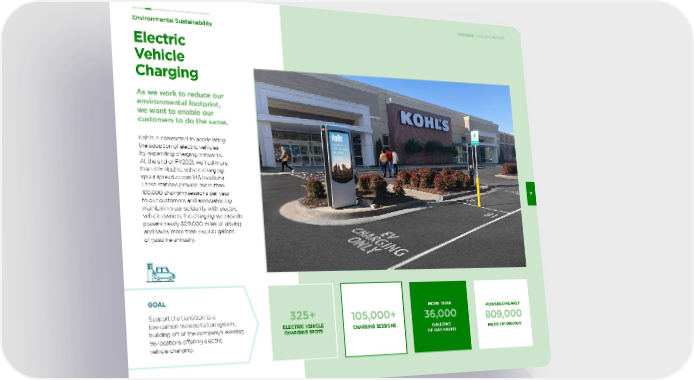 Kohl’s is committed to accelerating the adoption of electric vehicles by expanding charging networks. At the end of FY2021, we had more than 325 electric vehicle charging spots spread across 146 locations. These stations provide more than 105,000 charging sessions per year to our customers and associates. By maintaining our solidarity with electric vehicle owners, the charging we provide powers nearly 809,000 miles of driving and saves more than 36,000 gallons of gasoline annually. As we work to reduce our environmental footprint, we want to enable our customers to do the same. Environmental Sustainability 2021 ESG REPORT 16 325+ ELECTRIC VEHICLE CHARGING SPOTS 105,000+ CHARGING SESSIONS POWERED NEARLY 809,000 MILES OF DRIVING MORE THAN 36,000 GALLONS OF GAS SAVED GOAL Support the transition to a low-carbon transportation system, building off of the company’s existing 96 locations offering electric vehicle charging. Electric Vehicle Charging