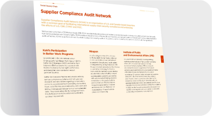 Nirapon As a founding member of the Alliance for Bangladesh Worker Safety (Alliance) in 2013, we continued our commitment to sustaining the culture of facility safety in Bangladesh by joining Nirapon in 2019. Nirapon, the next generation of the Alliance, is committed to helping the facilities from which its members source develop a sustainable culture of safety. Nirapon provides safety oversight, partnership with well-respected training providers, remediation, and capacity building and maintains an effective helpline. Nirapon is supported by 51 brands and serves over 330 factories. For more details on Nirapon’s efforts please see Nirapon.org. Supplier Compliance Audit Network Supplier Compliance Audit Network (SCAN) is an organization of U.S. and Canada-based importers with a common goal of facilitating international supply chain security compliance and endorsing the efiorts of U.S. CBP, CTPAT and MSC. Social Supply Chain 68 2021 ESG REPORT We have been a member of SCAN since August 2018. SCAN provides invaluable assistance in helping to standardize supply chain security audits to prevent multiple audits from being conducted over the same facility. SCAN members, including many of the world’s top importers, can now participate in a “shared audit” to help reduce duplicative audits at facilities. SCAN has performed more than 18,410 supply chain security audits in 78 countries and has 21,335 facilities within the SCAN Audit Sharing Network. Kohl’s Participation in Better Work Programs We participate in the International Labour Organization’s (ILO) Better Work Vietnam (BWV), Better Work Nicaragua (BWN) and Better Work Indonesia (BWI) programs that cooperate with facilities to improve human rights performance and strengthen labor standards in export garment industries. Better Work assesses facilities and provides advisory services to improve compliance with ILO core labor standards and national laws regarding compensation, contracts, occupational health and safety, and working hours. Select facilities are monitored by BWV, BWN and BWI to minimize audit fatigue from our own scheduled visits. This process allows facility management more time to focus on corrective action and sustainable, continual improvement. Institute of Public and Environmental Affairs (IPE) To supplement our responsible sourcing strategy, we leverage the Institute of Public and Environmental Affairs (IPE) to screen our suppliers in China for environmental compliance. IPE is a nonprofit environmental research organization that collects and analyzes government and corporate environmental information to provide transparency on supplier compliance. On a regular basis, we screen our suppliers within IPE’s Blue Map website to identify violations and, if found, create a corrective action plan for the respective vendor and facility to remediate within an assigned timeframe. In 2021, we screened over 81% of our China facilities and over 46% have rectified their violations. In 2022, we plan to continue expanding the scope of our supplier screening and push our suppliers to remediate outstanding environmental noncompliance.