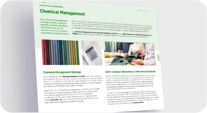 Environmental Sustainability 25 2021 ESG REPORT Chemical Management Our chemical management strategy actively works to identify, prevent, eliminate and reduce the use of certain chemicals in Kohl’s proprietary brand products. Kohl’s is committed to meeting and striving to exceed industry standards of chemical management across our teams, our vendors and our facilities by continuing to advance our restricted substances standards and specifications. We continuously seek solutions to reduce the use of chemicals in our products, work to eliminate chemicals of concern, and improve chemical management in our operations. We strive to increase transparency to chemicals contained in or used to make the products we sell at Kohl’s. Our Chemical Management Policy , Restricted Substance List (RSL) and the ZDHC Manufacturing Restricted Substances List (MRSL) apply to all textile and footwear raw materials and related finished products we sell within our proprietary brands. Chemical Management Strategy Kohl’s maintains a public Restricted Substance List (RSL) that limits or prohibits the presence of 122 chemicals within products manufactured for and sold to Kohl’s. Kohl’s RSL is in addition to, not in lieu of, all applicable laws. In some cases, we have chosen to set standards and specifications that are stricter than what is required around the use of formaldehyde and flame retardants. Beginning in 2021, Kohl’s became a participating Friend of the Zero Discharge of Hazardous Chemicals Foundation (ZDHC). ZDHC is the industry leader in Manufacturing Restricted Substances List (MRSL) management. In addition to our RSL, we are requiring that each of our suppliers adhere to the ZDHC MRSL 2.0 , which limits or prohibits the use of more than 220 chemicals in the manufacturing process of products. Safer Chemical Alternatives & Third Party Standards We are committed to working with our vendors and facilities to ensure the products we sell and use are safe and healthy for our customers and the environment. We expect our vendors to be constantly in search of safer chemical alternatives to achieve our RSL/MRSL requirements. Our vendors and suppliers are required to undergo third-party testing to ensure all products are produced, processed, manufactured and tested in full compliance with all applicable laws as well as any standards and specifications set by Kohl’s. As a pillar of our chemical management strategy, we have partnered with several third parties, including OEKO-TEX and Global Organic Textile Standard (GOTS), to provide certifications for several products within our private and exclusive brands in support of our chemical management goals. These certifications are communicated on product packaging as well as at Kohls.com in the product details section. Learn more about these certifications on our corporate website .