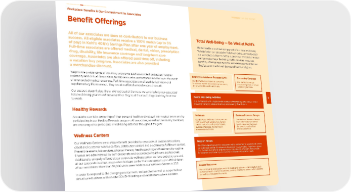 Benefit Offerings Workplace Benefits & Our Commitment to Associates 47 2021 ESG REPORT All of our associates are seen as contributors to our business success. All eligible associates receive a 100% match (up to 5% of pay) in Kohl’s 401(k) Savings Plan after one year of employment. Full-time associates are ofiered medical, dental, vision, prescription drug, disability, life insurance coverage and long-term care coverage. Associates are also ofiered paid time ofi, including a vacation buy program. Associates are also provided a merchandise discount. We provide a wide range of voluntary programs, such as accident protection, hospital indemnity and critical illness plans, to help associates protect and save money in the event of unexpected medical expenses. Part-time associates are offered dental, vision and supplementary life insurance. They are also offered a merchandise discount. Our support doesn’t stop there. We’re proud of the ways we contribute to our associates’ total well-being year-round because when they’re at their best, they can bring their best to work. Healthy Rewards Associates can take ownership of their personal health and reduce their medical premiums by participating in our Healthy Rewards program. All associates, as well as their family members, are encouraged to participate in well-being activities throughout the year. Wellness Centers Our Wellness Centers are a unique benefit provided to associates at corporate locations, credit and customer service centers, distribution centers and e-commerce fulfillment centers. Preventive exams, lab services, physical therapy, health coaching and treatment for routine illnesses are administered by compassionate and experienced health care professionals. Additionally, uniquely offered at our corporate wellness center, we have pediatric care and, at our corporate location, an on-site child care center that can support up to 450 children of our associates. More than 34,000 visits were made to our Wellness Centers in 2021. In order to respond to the changing environment, we launched as well as supported our virtual care business with on-site COVID-19 testing and vaccinations where available. Mental Well-Being Activities Our partnership with a digital health platform offers tips and resources on topics including managing stress and anxiety, appreciating life and more. Employee Assistance Program (EAP) Our EAP offers confidential counseling to address mental and emotional concerns, a mental health toolkit and more. Counseling Coverage Our medical coverage includes in-person or virtual counseling services. Webinars Our EAP and Wellness Center partners host a variety of webinars on mental health topics, including mindfulness, suicide awareness, mental health awareness and more. Business Resource Groups Our Business Resource Groups share information on mental health resources that meet the specific needs of our diverse workforce. Support Groups We offer support groups for associates, led by associates, to connect with others going through similar life situations. Examples include Healing Together, a group that focuses on infertility and pregnancy loss. We also offer parenting groups for adoption and fostering and parents of children with special needs. Leader Resources We continue to give leaders tools to create and cultivate a caring culture such as mental health check-in questions, training, videos and online toolkits specific to leading and supporting teams. Total Well-Being — Be Well at Kohl’s Mental health is a critical component of our total well-being. To help foster our associates’ total well-being, we’ve elevated our workplace culture to better support our associates’ mental well-being journeys. Be Well at Kohl’s provides resources, benefits, offerings and more for associates and their families that focus on mental well-being and health, including: