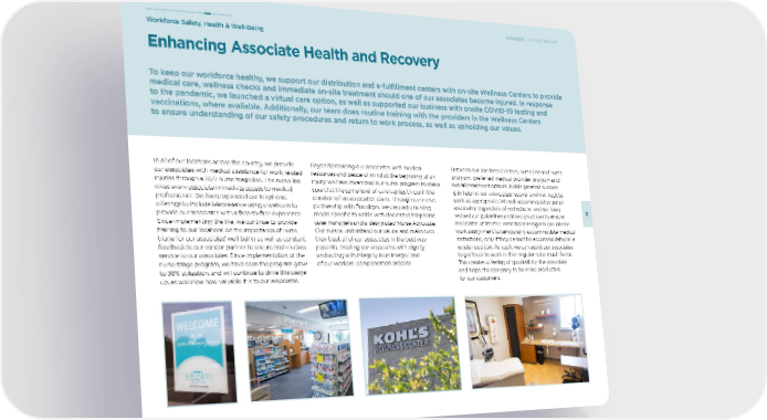 Workforce Safety, Health & Well-Being 75 2021 ESG REPORT Enhancing Associate Health and Recovery To keep our workforce healthy, we support our distribution and e-fulfillment centers with on-site Wellness Centers to provide medical care, wellness checks and immediate on-site treatment should one of our associates become injured. In response to the pandemic, we launched a virtual care option, as well as supported our business with onsite COVID-19 testing and vaccinations, where available. Additionally, our team does routine training with the providers in the Wellness Centers to ensure understanding of our safety procedures and return to work process, as well as upholding our values. In all of our locations across the country, we provide our associates with medical assistance for work-related injuries through a 24/7 nurse triage line. This nurse line gives every associate immediate access to medical professionals. We have expanded our telephonic offerings to include telepresence using a webcam to provide our associates with a face-to-face experience. Since implementing the line, we continue to provide training to our locations on the importance of nurse triage for our associates’ well-being as well as constant feedback to our vendor partner to ensure best-in-class service to our associates. Since implementation of the nurse triage program, we have seen the program grow to 38% utilization, and will continue to drive this usage up, as we know how valuable it is to our associates. Beyond providing our associates with medical resources and peace of mind at the beginning of an injury, we have revamped our nurse program to make sure that the same level of care carries through the duration of an associate’s claim. Through our nurse partnership with Paradigm, we created a nursing model specific to Kohl’s with dedicated telephonic case managers and a designated Nurse Advocate. Our nurses understand our values and make sure they treat all of our associates in the best way possible. Treating our associates with dignity and acting with integrity is an integral part of our workers’ compensation process. Between our Wellness Centers, nurse line and nurse program, preferred medical provider program and overall treatment options, Kohl’s greatest success is in helping our associates recover and get back to work as appropriate. We will accommodate injured associates regardless of restrictions, and we have revised our guidelines and best practices to ensure associates utilize the Transitional Program (an interim work assignment to temporarily accommodate medical restrictions) only if they cannot be accommodated in a regular position. As such, we can assist our associates to get back to work in their regular roles much faster. This creates a feeling of goodwill for the associate and helps the company to be more productive for our customers.