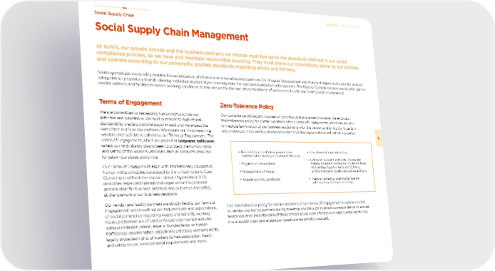 Social Supply Chain Management At Kohl’s, our private brands and the business partners we choose must live up to the standards defined in our social compliance process, so we have and maintain responsible sourcing. They must share our convictions, abide by our policies and operate according to our universally applied standards regarding ethics and fairness. Social Supply Chain 57 2021 ESG REPORT Terms of Engagement We are committed to respecting human rights across our activities and operations. We hold ourselves to high ethical standards to create a positive social impact and we expect the same from our business partners. We require our merchandising vendors and facilities to adhere to our Terms of Engagement. The Terms of Engagement, which are posted at Corporate.Kohls.com , reflect our high standards and seek to protect the human rights and safety of the workers who manufacture products procured for sale in our stores and online. Our Terms of Engagement align with internationally recognized human rights principles developed by the United Nations, Core Conventions of the International Labour Organization (ILO) and other respected international organizations to promote and maintain fair business practices and put ethics and safety at the forefront of our business decisions. Our vendor and facility partners are strictly held to our Terms of Engagement, which outlines our requirements and expectations of social compliance regarding wages and benefits, working hours, prohibited use of child or forced labor (which includes, without limitation, prison, slave or bonded labor or human trafficking), discrimination, disciplinary practices, women’s rights, legally protected rights of workers to free association, health and safety issues, environmental requirements and more. Sourcing products responsibly requires the collaboration of internal and external business partners. Our Product Development and Merchant departments identify product categories for proprietary brands, develop individual product styles and negotiate the purchase transaction with suppliers. The Factory Compliance team works with agents, vendor partners and facilities to assess working conditions to help ensure the fair and ethical treatment of workers and a safe and healthy work environment. Zero-Tolerance Policy Our compliance philosophy focuses on continuous improvement; however, we enforce a zero-tolerance policy for certain violations of our Terms of Engagement, which can result in immediate termination of our business relationship with the vendor and/or facility. In certain circumstances, merchandise produced under the following conditions will not be accepted: Our zero-tolerance policy for certain violations of our Terms of Engagement is communicated to vendor and facility partners during meetings and through business correspondence to ensure awareness and understanding of these critical issues in an effort to eliminate human rights risks in our supply chain and ensure our goods are responsibly sourced. • Forced labor, child labor, prison labor, bonded labor, slavery or human trafficking • Physical or sexual abuse • Nonpayment of wages • Unsafe working conditions • Unauthorized subcontracting • Unethical business practices: Attempted bribery of social compliance, Customs Trade Partnership Against Terrorism (CTPAT), environmental or quality assurance auditors • Trans-shipment or altering/tampering with country-of-origin markings