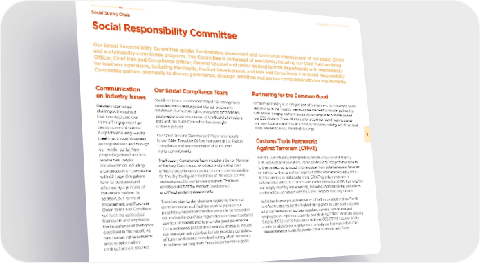 Social Responsibility Committee Our Social Responsibility Committee guides the direction, assessment and continuous improvement of our social, CTPAT and sustainability compliance programs. The Committee is composed of executives, including our Chief Merchandising Oficer, Chief Risk and Compliance Oficer, General Counsel and senior leadership from departments with responsibility for business operations, including Merchants, Product Development, and Risk and Compliance. The Social Responsibility Committee gathers biannually to discuss governance, strategic initiatives and partner compliance with our requirements. Social Supply Chain 67 2021 ESG REPORT Our Social Compliance Team Social, economic, environmental and risk management considerations are integrated into our purchasing processes. Our human rights policy commitments are approved and communicated at the Board of Directors level and the Audit Committee has oversight of these policies. Our Chief Risk and Compliance Officer, who reports to our Chief Executive Officer, has oversight of Factory Compliance and implementation of our human rights commitments. The Factory Compliance Team includes a Senior Manager of Factory Compliance, who leads a dedicated team of highly experienced compliance associates responsible for the day-to-day administration of the social, CTPAT and sustainability compliance program. This team is independent of the Product Development and Merchandising departments. Therefore, day-to-day decisions regarding the social compliance status of facilities used to produce our proprietary-brand merchandise are made by associates not involved in purchase negotiations to prevent potential conflicts of interest and to promote good governance. Our governance policies and business strategies include risk management activities to help provide a consistent, efficient and socially compliant supply chain necessary to achieve our long-term financial performance goals. Partnering for the Common Good Social responsibility is an integral part of our business. To deliver and create real change in the industry, we recognize the need to work in partnership with others. Forging partnerships to drive change is an essential part of our ESG strategy. These alliances offer a common benchmark to assess our own decisions and they also provide the entire industry with the critical mass needed to enact meaningful change. Customs Trade Partnership Against Terrorism (CTPAT) Kohl’s is committed to the highest standards of quality and integrity in its products and operations. Kohl’s continues to recognize the need to further protect our product and resources from potential acts of terrorism or trafficking throughout our segment of the international supply chain. Kohl’s commits to participate in the CTPAT voluntary program in collaboration with U.S. Customs and Border Protection (CBP) to strengthen our supply chain by implementing, following and maintaining procedures and practices consistent with the CTPAT Importer Security Criteria. Kohl’s has been a proud member of CTPAT since 2006 and is a Tier III certified trusted trader, the highest rating given by CBP. Kohl’s requires all of its international facilities, suppliers, carriers, contractors and employees to implement, comply and abide by CTPAT Minimum Security Criteria (MSC). Kohl’s has conducted over 600 CTPAT security SCAN audits to validate our supply chain compliance. For more information please reference Kohl’s Corporate CTPAT Commitment Policy. Communication on Industry Issues Retailers face varied challenges throughout their supply chains. Our Terms of Engagement are clearly communicated to our partners during vendor meetings, through business correspondence and through our vendor portal. New proprietary-brand vendors receive new vendor documentation, including a Certification of Compliance with All Legal Obligations form to be signed and returned by a principal of the vendor partner. In addition, our Terms of Engagement and Purchase Order Terms and Conditions set forth the contractual framework and emphasize the importance of the topics described in this report. As new human rights concerns arise, supplementary certifications are required.