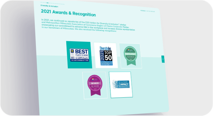 In 2021, we continued as signatories of the CEO Action for Diversity & Inclusion™ pledge and Metropolitan Milwaukee Association of Commerce Region of Choice Corporate Pledge, showcasing our commitment to advance D&I in the workplace and increase diverse representation in our hometown of Milwaukee. We also received the following recognitions: Diversity & Inclusion 2021 Awards & Recognition 32 2021 ESG REPORT 2021 ESG REPORT