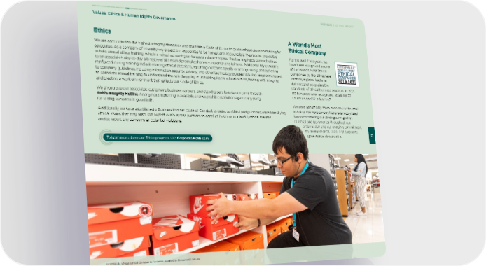 Ethics Values, Ethics & Human Rights Governance 71 2021 ESG REPORT We are committed to the highest integrity standards and maintain a Code of Ethics to guide ethical decision-making for associates. As a company of integrity, we expect our associates to be honest and accountable. We require associates to take annual ethics training, which is refreshed each year to cover relevant topics. The training helps connect ethics to an associate’s day-to-day job responsibilities and promotes honesty, integrity and fairness. Additional key concepts reinforced during training include making ethical decisions, reporting concerns openly or anonymously, and adhering to company guidelines, including information security, privacy, and other technology policies. We also require managers to complete annual training to understand the role they play in upholding Kohl’s ethical culture, leading with integrity, and creating a work environment that reflects our Code of Ethics. We encourage our associates, customers, business partners, and stakeholders to raise concerns through Kohl’s Integrity Hotline . Anonymous reporting is available and we prohibit retaliation against any party for raising concerns in good faith. Additionally, we have established a Business Partner Code of Conduct to assist our third-party contractors in identifying ethical issues that may arise. We expect our business partners to conduct business in a lawful, ethical manner and to report any concerns or potential violations. A World’s Most Ethical Company For the past three years, we have been recognized as one of the World’s Most Ethical Companies by the Ethisphere Institute, a global leader in defining and advancing the standards of ethical business practices. In 2021, 137 honorees were recognized, spanning 22 countries and 37 industries 3 . We were one of only three honorees in the retail industry. We were among honorees recognized for demonstrating our strategic integration of ethics and governance throughout our organization and our ongoing commitment to environmental, social and corporate governance stewardship. 3 2021 World’s Most Ethical Companies honorees updated by Ethisphere Institute To learn more about our Ethics program, visit Corporate.Kohls.com .