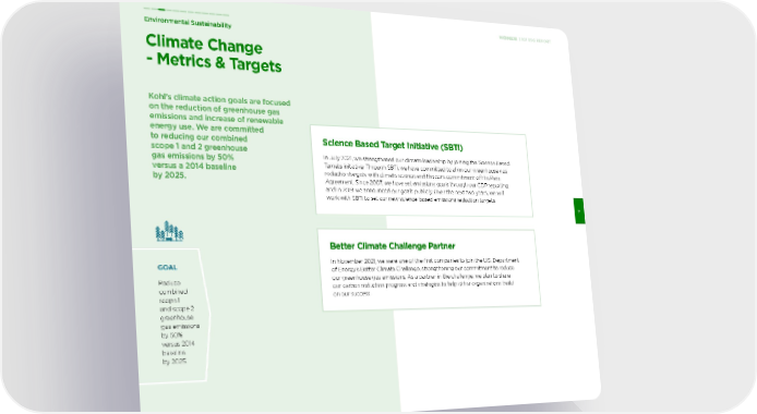 GOAL Reduce combined scope 1 and scope 2 greenhouse gas emissions by 50% versus 2014 baseline by 2025. Climate Change - Metrics & Targets Kohl’s climate action goals are focused on the reduction of greenhouse gas emissions and increase of renewable energy use. We are committed to reducing our combined scope 1 and 2 greenhouse gas emissions by 50% versus a 2014 baseline by 2025. Science Based Target Initiative (SBTi) In July 2021, we strengthened our climate leadership by joining the Science Based Targets initiative. Through SBTi, we have committed to align our greenhouse gas reduction targets with climate science and the core commitment of the Paris Agreement. Since 2007, we have set emissions goals through our CDP reporting and in 2019 we announced our goals publicly. Over the next two years, we will work with SBTi to set our new science-based emissions reduction targets. Environmental Sustainability 11 2021 ESG REPORT Better Climate Challenge Partner In November 2021, we were one of the first companies to join the U.S. Department of Energy’s Better Climate Challenge, strengthening our commitment to reduce our greenhouse gas emissions. As a partner in the challenge, we plan to share our carbon reduction progress and strategies to help other organizations build on our success.