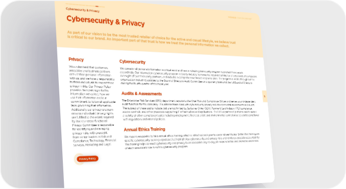 Cybersecurity We consider all personal information a critical asset and have a robust cybersecurity program to protect those assets accordingly. Our information cybersecurity program is tied to industry frameworks, requires training for all associates, encompasses oversight of our third-party partners, and includes a comprehensive breach response plan. The program is visible throughout the organization including updates to the Board of Directors Audit Committee on a quarterly basis and the full Board of Directors during the fourth quarter of the fiscal year. Audits & Assessments The Enterprise Risk Services (ERS) department reports to the Chief Risk and Compliance Officer and serves as an independent audit function for the company. This internal team conducts cybersecurity, privacy and environmental assessments and audits. The subject of these audits include, but are not limited to, Sarbanes-Oxley (SOX), Payment Card Industry (PCI) compliance, access controls, and other processes supporting IT infrastructure and applications. The ERS department performs audits across a variety of other compliance topics including employment, financial, credit and environmental control areas to assess compliance with regulations and internal policies. Annual Ethics Training We require associates to take annual ethics training, which is refreshed each year to cover relevant topics. Within this training are specific cybersecurity training vignettes that highlight key cybersecurity and privacy risks and reinforce associate accountability. The training helps connect cybersecurity and privacy to an associate’s day-to-day job responsibilities and promotes awareness of each associate’s role in Kohl’s cybersecurity program. Cybersecurity & Privacy 77 2021 ESG REPORT Cybersecurity & Privacy As part of our vision to be the most trusted retailer of choice for the active and casual lifestyle, we believe trust is critical to our brand. An important part of that trust is how we treat the personal information we collect. Privacy Policy Privacy We understand that customers, associates and business partners entrust their personal information with us, and we have a responsibility to those individuals to respect their privacy rights. Our Privacy Policy provides transparency into the information we collect, how we use that information and our commitment to follow all applicable laws governing that information. Additionally, our privacy program ensures individuals’ privacy rights are fulfilled to the extent required by law. Our cross-functional Privacy Committee is responsible for identifying and managing privacy risks, with oversight from senior leaders in Risk and Compliance, Technology, Financial Services, Marketing and Legal.