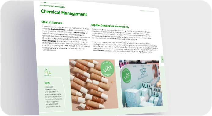Environmental Sustainability 26 2021 ESG REPORT Chemical Management Clean at Sephora In 2020, Kohl’s and Sephora announced their long-term strategic partnership. Sephora at Kohl’s is a fully immersive, premium beauty destination. Sephora has a robust chemicals policy for its private-label products and since 2019 has been taking significant steps forward in addressing chemicals of high concern (CHCs) in branded products it sells. Its voluntary but growing Clean at Sephora program provides a particularly transparent and comprehensive approach. Sephora has shown significant progress in eliminating CHCs from products it sells and outlined significant efforts to help ensure CHCs are replaced with safer alternatives. Supplier Disclosure & Accountability We monitor suppliers’ environmental impacts through the Higg Facility Environmental Module (Higg FEM). All approved facilities producing Kohl’s proprietary brand products are required to complete the Higg FEM annually. The Higg FEM includes a chemical management section that assesses and identifies opportunities for facilities to improve performance in several areas including production processes that use chemicals to make a product. Suppliers are required under Kohl’s Purchase Order Terms and Conditions to ensure that any merchandise manufactured for and sold to Kohl’s is compliant with all applicable federal, state and local laws and regulations, as well as any standards and specifications set by Kohl’s, including those regarding chemical safety and harmful/toxic substances. Achieving compliance with any chemical management standards and specifications set by Kohl’s will be a prerequisite of working with us in the future. GOAL Emphasize the elimination and reduction of chemicals and strive for zero discharge of hazardous chemicals in tier 1 suppliers for select Kohl’s proprietary brands.