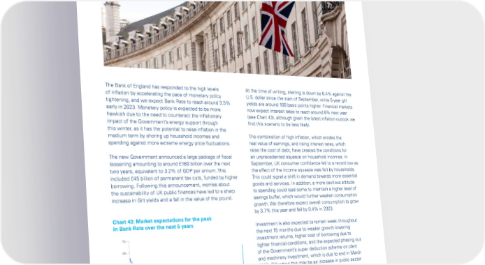 Global Economic Outlook – September 2022 The Bank of England has responded to the high levels At the time of writing, sterling is down by 6.4% against the of inflation by accelerating the pace of monetary policy U.S. dollar since the start of September, while 5-year gilt tightening, and we expect Bank Rate to reach around 3.5% yields are around 190 basis points higher. Financial markets early in 2023. Monetary policy is expected to be more now expect interest rates to reach around 6% next year hawkish due to the need to counteract the inflationary (see Chart 43), although given the latest inflation outlook we impact of the Government’s energy support through find this scenario to be less likely. this winter, as it has the potential to raise inflation in the medium term by shoring up household incomes and The combination of high inflation, which erodes the spending against more extreme energy price fluctuations. real value of earnings, and rising interest rates, which raise the cost of debt, have created the conditions for The new Government announced a large package of fiscal an unprecedented squeeze on household incomes. In loosening amounting to around £160 billion over the next September, UK consumer confidence fell to a record low as two years, equivalent to 3.2% of GDP per annum. This the effect of the income squeeze was felt by households. included £45 billion of permanent tax cuts, funded by higher This could signal a shift in demand towards more essential borrowing. Following this announcement, worries about goods and services. In addition, a more cautious attitude the sustainability of UK public finances have led to a sharp to spending could lead some to maintain a higher level of increase in Gilt yields and a fall in the value of the pound. savings buffer, which would further weaken consumption growth. We therefore expect overall consumption to grow by 3.7% this year and fall by 0.4% in 2023. Chart 43: Market expectations for the peak in Bank Rate over the next 5 years Investment is also expected to remain weak throughout the next 15 months due to weaker growth lowering 7% investment returns, higher cost of borrowing due to 6% tighter financial conditions, and the expected phasing out of the Government’s super deduction scheme on plant 5% and machinery investment, which is due to end in March 4% 2023. Offsetting this may be an increase in public sector investment, although details of specific policies remain Interest rate3% unclear. Our latest estimates for investment point to growth 2% of 5.8% in 2022, followed by a milder rise of 1.3% in 2023. 1% 0% 2008 2010 2012 2014 2016 2018 2020 2022 Bank Rate Expected peak in Bank Rate Source: Bank of England, BIS, KPMG analysis. Note: Latest data are for 26 September. © 2022 Copyright owned by one or more of the KPMG International entities. KPMG International entities provide no services to clients. All rights reserved. 46