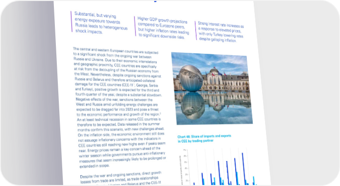 Global Economic Outlook – September 2022 Central and Eastern Europe: Not a uniform story Substantial, but varying Higher GDP growth projections Strong interest rate increases as energy exposure towards compared to Eurozone peers, a response to elevated prices, Russia leads to heterogenous but higher inflation rates leading with only Turkey lowering rates shock impacts. to significant downside risks. despite galloping inflation. The central and eastern European countries are subjected to a significant shock from the ongoing war between Russia and Ukraine. Due to their economic interrelations and geographic proximity, CEE countries are specifically at risk from the decoupling of the Russian economy from the West. Nevertheless, despite ongoing sanctions against Russia and Belarus and therefore anticipated collateral 1 damage for the CEE countries (CEE-11 , Georgia, Serbia and Turkey), positive growth is expected for the third and fourth quarter of the year, despite a substantial slowdown. Negative effects of the war, sanctions between the West and Russia amid unfolding energy challenges are expected to be dragged far into 2023 and pose a threat 2 to the economic performance and growth of the region. An at least technical recession in some CEE countries is therefore to be expected. Data released in the summer months confirm this scenario, with new challenges ahead. On the inflation side, the economic environment still does not assuage inflationary concerns with the indicators in Chart 46: Share of imports and exports CEE countries still reaching new highs even if peaks seem in CEE by trading partner near. Energy prices remain a key concern ahead of the winter season while governments pursue anti-inflationary 7% measures that seem increasingly likely to be prolonged or ts 6% extended in scope. 5% ts and expor4% Despite the war and ongoing sanctions, direct growth losses from trade are limited, as trade relationships 3% between Russia, Ukraine and Belarus and the CEE-11 2% economies overall are not substantial. As Chart 46 shows, Share of total impor1% direct import as well as export links between CEE and 0% Ukraine, Russia and Belarus are limited, compared to overall us us us us us us us us elarussia elarussia elarussia elarussia elarussia elarussia elarussia elarussia trade volumes (total imports from Russia amount to 1-6.1% B R UkraineBR UkraineB R UkraineBR UkraineB R UkraineBR UkraineB R UkraineBR Ukraine and exports to 0.7-2.9%). It is trade links to other countries Croatia Czechia Hungary Poland Romania Serbia Slovakia Slovenia of the European Union that are essential for the region. Imports Exports Source: UN Comtrade, World Bank, KPMG analysis. 1 CEE-11 countries: Bulgaria, Croatia, Czech Republic, Estonia, Hungary, Latvia, Lithuania, Poland, Romania, Slovenia, Slovakia. 2 Sovereign and Public Sector, Scope Ratings GmbH “Central and Eastern Europe MidYear Sovereign Outlook”, July 2022 (https://www.scopegroup.com/dam/jcr:129f4653-633a-41ab-b756-c4cdf2260787/Scope%20Ratings_2022%20Mid-Year%20CEE%20Sovereign%20Outlook.pdf) © 2022 Copyright owned by one or more of the KPMG International entities. KPMG International entities provide no services to clients. All rights reserved. 48