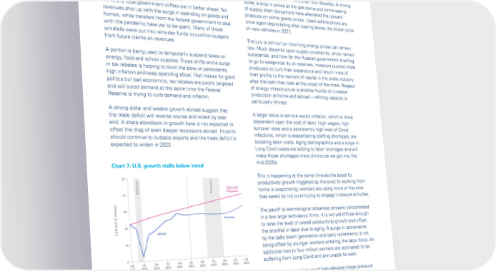 Global Economic Outlook – September 2022 The pandemic aid that buoyed federal spending in 2020 Inflation slowly cools and 2021 has come to an end, while much of the spending associated with the infrastructure bill and efforts to A perfect storm of strong demand, supply chain disruptions deal with climate change will take time to ramp up. The and the war in Ukraine created the largest move up in full effects of those latter shifts will not be felt until the inflation we have seen in more than four decades. A strong mid-2020s. dollar, a drop in prices at the gas pump and some easing State and local government coffers are in better shape. Tax of supply chain disruptions have alleviated the upward revenues shot up with the surge in spending on goods and pressure on some goods prices. Used vehicle prices are homes, while transfers from the federal government to deal once again depreciating after soaring above the sticker price with the pandemic have yet to be spent. Many of those of new vehicles in 2021. windfalls were put into rainy-day funds to cushion budgets The jury is still out on how long energy prices can remain from future claims on revenues. low. Much depends upon supply constraints, which remain A portion is being used to temporarily suspend taxes on substantial, and how far the Russian government is willing energy, food and school supplies. Those shifts and a surge to go to weaponize its oil reserves. Investors pushed shale in tax rebates is helping to blunt the blow of persistently producers to curb their expansions and return more of high inflation and keep spending afloat. That makes for good their profits to the owners of capital in the shale industry, politics but bad economics; tax rebates are poorly targeted after the bath they took at the onset of the crisis. Neglect and will boost demand at the same time the Federal of energy infrastructure is another hurdle to increase Reserve is trying to curb demand and inflation. production at home and abroad – refining capacity is particularly limited. A strong dollar and weaker growth abroad suggest that A larger issue is service sector inflation, which is more the trade deficit will reverse course and widen by year- dependent upon the cost of labor. High wages, high end. A sharp slowdown in growth here is not expected to turnover rates and a persistently high level of Covid offset the drag of even deeper recessions abroad. Imports infections, which is exacerbating staffing shortages, are should continue to outpace exports and the trade deficit is boosting labor costs. Aging demographics and a surge in expected to widen in 2023. Long Covid cases are adding to labor shortages and will make those shortages more chronic as we get into the Chart 7: U.S. growth stalls below trend mid-2020s. 22 This is happening at the same time as the boost to productivity growth triggered by the pivot to working from ecession ecession CBO 2020 home is evaporating; workers are using more of the time 21 R R Projection they saved by not commuting to engage in leisure activities. rillions20 The payoff to technological advances remains concentrated T Forecast in a few large tech-savvy firms. It is not yet diffuse enough , 2021 $, 19 to raise the level of overall productivity growth and offset GDP Actual the shortfall in labor due to aging. A surge in retirements 18 by the baby boom generation and early retirements is not being offset by younger workers entering the labor force. An 17 additional two to four million workers are estimated to be Q4 Q2 Q4 Q2 Q4 Q2 Q4 Q2 Q4 Q2 Q4 suffering from Long Covid and are unable to work. 2019 2020 2020 2021 2021 2022 2022 2023 2023 2024 2024 Source: KPMG Economics, Bureau of Economic Analysis. A surge in immigration could help alleviate those pressure but doesn’t seem likely. The backlogs to immigration created by the pandemic are still substantial, while immigration reform remains on hold. Foreign students, who are dwindling in ranks, are looking for guarantees that they can continue to work in the U.S. once they relocate. © 2022 Copyright owned by one or more of the KPMG International entities. KPMG International entities provide no services to clients. All rights reserved. 8