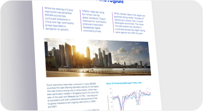 Global Economic Outlook – September 2022 ASEAN: Global headwinds weighing on trade in the region While the relaxing of Covid Inflation rates are rising While interest rates in the region are restrictions has benefited but remain low by generally being raised, the pace of ASEAN economies, global standards. Export tightening is slower than in some continued lockdowns in revenues for commodity developed economies. The move China and high commodity producers have been into safe assets has resulted in prices have been a boosted by higher currencies across the region losing dampener on growth. commodity prices. value against the USD this year. Covid restrictions have been unwound in many ASEAN Chart 15: Purchasing Managers’ Index, Asia countries this year allowing domestic activity to normalize. This has driven a strong rise in consumption, which has 60 been particularly marked in Singapore (up 6.1% since the 55 start of the year) and Malaysia (up 11.7%) – the rebound is consistent with both jurisdictions having some of the 50 toughest lockdowns and ongoing restrictions in 2020 and 2021. 45 ve 50 = expansionary40 Solid consumption growth has been somewhat offset by difficult external conditions (a result of the lockdowns in 35 Index, abo China) and a mixed outturn for investment growth; rising 30 inflation and borrowing costs have combined with concerns about the outlook to weigh on business’ capital expenditure 25 Sep Jan May Sep Jan May Sep Jan May Sep plans. Overall, the pace of GDP growth in most ASEAN 2019 2020 2020 2020 2021 2021 2021 2022 2022 2022 countries has broadly held steady this year, with the boost Singapore Vietnam Thailand Malaysia Indonesia to household spending offset by drags elsewhere. But there have been some notable exceptions, with Malaysia Source: KPMG Economics, IHS Markit, Macrobond. recording a spectacular pace of GDP growth in the first half of the year. © 2022 Copyright owned by one or more of the KPMG International entities. KPMG International entities provide no services to clients. All rights reserved. 17