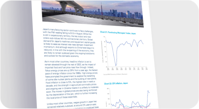 Global Economic Outlook – September 2022 Japan’s manufacturing sector continues to face challenges, Chart 21: Purchasing Managers’ Index, Japan with the PMI reading falling to 51.5 in August. While this is still in expansionary territory, the key output and new 55 orders sub-indices fell into contractionary territory. Global demand for Japan’s machinery and equipment capital goods 50 is likely to ease as interest rate rises dampen investment 45 momentum. And although exports to China have begun to rebound, in line with the re-opening of the economy, they 40 are likely to remain subdued given the ongoing lockdowns and outlook for the domestic economy. 35 As-in most other countries, headline inflation is set to Index, 50 = expansionary/contractionary30 remain elevated through the rest of 2022, as the impact of imported food and fuel price rises flow through. Indeed, 25 Sep Jan May Sep Jan May Sep Jan May Sep Tokyo energy prices are up 29% from a year ago, the fastest 2019 2020 2020 2020 2021 2021 2021 2022 2022 2022 pace of energy inflation since the 1980s. High energy prices have prompted the government to explore the restarting Source: KPMG Economics, IHS Markit, Macrobond. of some idle nuclear plants and the building of new plants. Food inflation is close to 5%, the highest rate in nearly a decade, and the strength in agricultural commodity prices Chart 22: CPI inflation, Japan and ongoing war in Ukraine means it is unlikely to moderate soon. The moves in global prices are also being reinforced 20% by the depreciation of the yen, which is further increasing the local price of these essentials. 15% 10% Unlike most other countries, wages growth in Japan has remained relatively subdued, at around 2% year-on-year, -on-y5% with the Spring Negotiation culminating in a subdued base % y pay increase. Given this, the risk of wage growth lifting 0% markedly in response to inflationary pressures is very low, and this in turn is limiting domestically-generated price -5% increases. Looking ahead, headline inflation is expected to moderate to 1.6% in 2023, as the impact of external price -10% 2012 2013 2014 2015 2016 2017 2018 2019 2020 2021 2022 moves in 2022 drops out of the calculation. Fuel and energy Food Headline Source: KPMG Economics, Statistics Bureau of Japan Macrobond. © 2022 Copyright owned by one or more of the KPMG International entities. KPMG International entities provide no services to clients. All rights reserved. 24