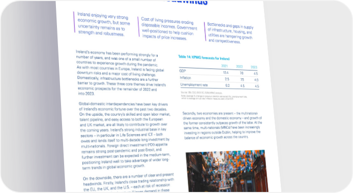 Global Economic Outlook – September 2022 Ireland: Recent momentum, stumbles against headwinds Ireland enjoying very strong Cost of living pressures eroding Bottlenecks and gaps in supply economic growth, but some disposable incomes. Government of infrastructure, housing, and uncertainty remains as to well-positioned to help cushion utilities are hampering growth strength and robustness. impacts of price increases. and competitiveness. Ireland’s economy has been performing strongly for a Table 14: KPMG forecasts for Ireland number of years, and was one of a small number of 2021 2022 2023 countries to experience growth during the pandemic. As with most countries in Europe, Ireland is facing global GDP 13.4 7. 0 4.5 downturn risks and a major cost of living challenge. Inflation 2.5 7. 5 4.0 Domestically, infrastructure bottlenecks are a further barrier to growth. These three core themes drive Ireland’s Unemployment rate 6.2 4.5 4.5 economic prospects for the remainder of 2022 and Source: CBI, CSO, DOF, EC, ESRI, KPMG analysis. into 2023. Note: Average % change on previous calendar year except for unemployment rate, which is average annual rate. Inflation measure used is the HICP. Global-domestic interdependencies have been key drivers of Ireland’s economic fortune over the past two decades. On the upside, the country’s skilled and open labor market, Secondly, two economies are present – the multinational- talent pipeline, and easy access to both the European driven economy and the domestic economy – and growth of and UK market, are all likely to contribute to growth over the former consistently outpaces growth of the latter. At the the coming years. Ireland’s strong industrial base in key same time, multi-nationals (MNCs) have been increasingly sectors – in particular in Life Sciences and ICT – both investing in regions outside Dublin, helping to improve the owes and lends itself to multi-decade long investment by balance of economic growth across the country. multi-nationals. Foreign direct investment (FDI) appetite remains strong post-pandemic and post-Brexit, and further investment can be expected in the medium-term, positioning Ireland well to take advantage of wider long- term trends in global economic growth. On the downside, there are a number of clear and present headwinds. Firstly, Ireland’s close trading relationship with the EU, the UK, and the U.S. – each at risk of recession – creates risks of a downturn if lower demand in these three economies creates negative spill-over effects. To mitigate risks of contagion from key trading partners, Ireland’s export-focused economy has become increasingly diversified, but it is unlikely to be sufficient to fully insulate the country from such shocks. © 2022 Copyright owned by one or more of the KPMG International entities. KPMG International entities provide no services to clients. All rights reserved. 41