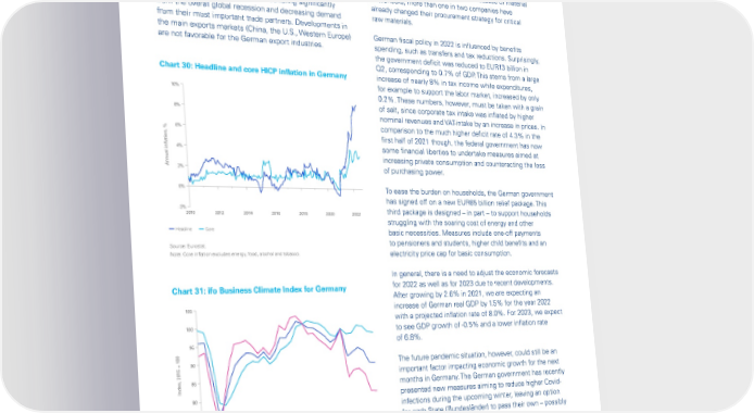 Global Economic Outlook – September 2022 Accordingly, Germany experienced an inflation rate of 8.2% Supply chain disruptions, amplified by China’s zero-Covid in Q2, while wages increased by only 2.9% compared strategy, are the main challenge for several industries, to Q1. HICP inflation rate reached 8.8% in August 2022. including key sectors such as the mechanical engineering The high inflation will slow the recently recovered private as well as the automotive industry. These disruptions are consumption, resulting in lower growth expectations. expected to continue well into 2023. Because of material The German economy is crucially dependent on trade and bottlenecks, more than one in two companies have exports. Exporting companies are suffering significantly already changed their procurement strategy for critical from the overall global recession and decreasing demand raw materials. from their most important trade partners. Developments in the main exports markets (China, the U.S., Western Europe) German fiscal policy in 2022 is influenced by benefits are not favorable for the German export industries. spending, such as transfers and tax reductions. Surprisingly, the government deficit was reduced to EUR13 billion in Q2, corresponding to 0.7% of GDP. This stems from a large Chart 30: Headline and core HICP inflation in Germany increase of nearly 8% in tax income while expenditures, for example to support the labor market, increased by only 10% 0.2%. These numbers, however, must be taken with a grain of salt, since corporate tax intake was inflated by higher 8% nominal revenues and VAT-intake by an increase in prices. In 6% comparison to the much higher deficit rate of 4.3% in the first half of 2021 though, the federal government has now 4% some financial liberties to undertake measures aimed at increasing private consumption and counteracting the loss Annual inflation, %2% of purchasing power. 0% To ease the burden on households, the German government has signed off on a new EUR65 billion relief package. This -2% third package is designed – in part – to support households 2010 2012 2014 2016 2018 2020 2022 struggling with the soaring cost of energy and other Headline Core basic necessities. Measures include one-off payments Source: Eurostat. to pensioners and students, higher child benefits and an Note: Core inflation excludes energy, food, alcohol and tobacco. electricity price cap for basic consumption. In general, there is a need to adjust the economic forecasts Chart 31: ifo Business Climate Index for Germany for 2022 as well as for 2023 due to recent developments. After growing by 2.6% in 2021, we are expecting an 105 increase of German real GDP by 1.5% for the year 2022 with a projected inflation rate of 8.0%. For 2023, we expect 100 to see GDP growth of -0.5% and a lower inflation rate 95 of 6.8%. 0 0 5 = 190 The future pandemic situation, however, could still be an 1 85 important factor impacting economic growth for the next Index, 20 months in Germany. The German government has recently 80 presented new measures aiming to reduce higher Covid- infections during the upcoming winter, leaving an option 75 for each State (Bundesländer) to pass their own – possibly 70 stricter – measures. Jan Apr Jul Oct Jan Apr Jul Oct Jan Apr Jul 2020 2021 2022 Business climate Business situation Business expectations Dr. Ventzislav Kartchev Source: ifo Institute. Head of Business Intelligence/Markets, KPMG Germany © 2022 Copyright owned by one or more of the KPMG International entities. KPMG International entities provide no services to clients. All rights reserved. 32