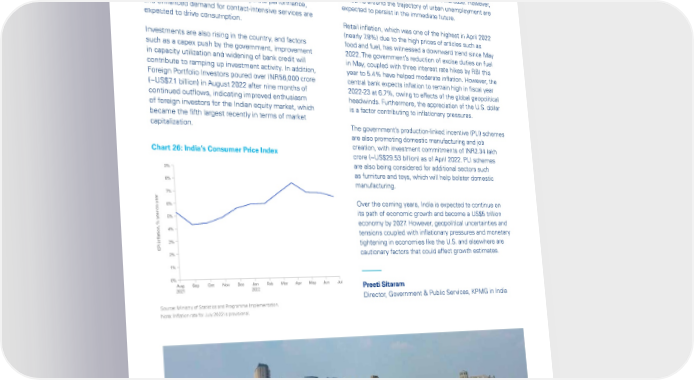 Global Economic Outlook – September 2022 An uptick in domestic economic activity is observable, with Unemployment rates, however, surged to a 12-month high indicators of urban and rural demand such as automobile of close to 8.3% in August 2022. Rural unemployment, sales, consumer durables manufacture, and domestic which had been affected by factors such as erratic rainfall, air travel showing improvement. A positive movement in is expected to decrease towards the end of the monsoon domestic demand is discernible from the robust import season, as agricultural job opportunities increase. However, requirements for non-oil and non-gold commodities. Rising concerns around the trajectory of urban unemployment are consumer optimism, improved corporate performance, expected to persist in the immediate future. and enhanced demand for contact-intensive services are expected to drive consumption. Retail inflation, which was one of the highest in April 2022 (nearly 7.8%) due to the high prices of articles such as Investments are also rising in the country, and factors food and fuel, has witnessed a downward trend since May such as a capex push by the government, improvement 2022. The government’s reduction of excise duties on fuel in capacity utilization and widening of bank credit will in May, coupled with three interest rate hikes by RBI this contribute to ramping up investment activity. In addition, year to 5.4% have helped moderate inflation. However, the Foreign Portfolio Investors poured over INR56,000 crore central bank expects inflation to remain high in fiscal year (~US$7.1 billion) in August 2022 after nine months of 2022-23 at 6.7%, owing to effects of the global geopolitical continued outflows, indicating improved enthusiasm headwinds. Furthermore, the appreciation of the U.S. dollar of foreign investors for the Indian equity market, which is a factor contributing to inflationary pressures. became the fifth largest recently in terms of market capitalization. The government’s production-linked incentive (PLI) schemes are also promoting domestic manufacturing and job Chart 26: India’s Consumer Price Index creation, with investment commitments of INR2.34 lakh crore (~US$29.53 billion) as of April 2022. PLI schemes 9% are also being considered for additional sectors such as furniture and toys, which will help bolster domestic 8% manufacturing. 7% 6% Over the coming years, India is expected to continue on -on-year its path of economic growth and become a US$5 trillion 5% economy by 2027. However, geopolitical uncertainties and 4% tensions coupled with inflationary pressures and monetary 3% tightening in economies like the U.S. and elsewhere are CPI inflation, % year 2% cautionary factors that could affect growth estimates. 1% 0% Aug Sep Oct Nov Dec Jan Feb Mar Apr May Jun Jul Preeti Sitaram 2021 2022 Director, Government & Public Services, KPMG in India Source: Ministry of Statistics and Programme Implementation. Note: Inflation rate for July 2022 is provisional. © 2022 Copyright owned by one or more of the KPMG International entities. KPMG International entities provide no services to clients. All rights reserved. 27