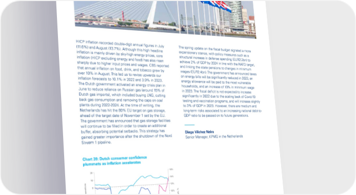 Global Economic Outlook – September 2022 HICP inflation recorded double-digit annual figures in July The spring update on the fiscal budget signaled a more (11.6%) and August (13.7%). Although this high headline expansionary stance, with policy measures such as a inflation is mainly driven by sky-high energy prices, core structural increase in defense spending (EUR2.2bn) to inflation (HICP excluding energy and food) has also risen achieve 2% of GDP by 2024 in line with the NATO target, sharply due to higher input prices and wages. CBS reported and linking the state pensions to changes in minimum that annual inflation on food, drink, and tobacco grew by wages (EUR2.4bn). The government has announced taxes over 10% in August. This led us to revise upwards our on energy bills will be significantly reduced in 2023, an inflation forecasts to 10.1% in 2022 and 3.9% in 2023. energy allowance will be paid to the most vulnerable The Dutch government activated an energy crisis plan in households, and an increase of 10% in minimum wage June to reduce reliance on Russian gas (around 15% of in 2023. The fiscal deficit is not expected to increase Dutch gas imports), which included buying LNG, cutting significantly in 2022 due to the scaling back of Covid-19 back gas consumption and removing the caps on coal testing and vaccination programs, and will increase slightly plants during 2022-2024. At the time of writing, the to 3% of GDP in 2023. However, there are medium and Netherlands has hit the 80% EU target on gas storage, long-term risks associated to an increasing national debt-to- ahead of the target date of November 1 set by the EU. GDP ratio to be passed on to future generations. The government has announced that gas storage facilities will continue to be filled in order to create an additional buffer, absorbing potential setbacks. This strategy has Diego Vilchez Neira gained greater importance after the shutdown of the Nord Senior Manager, KPMG in the Netherlands Stream 1 pipeline. Chart 39: Dutch consumer confidence plummets as inflation accelerates 20 16% 10 14% 0 12% -10 10% -20 8% -30 6% Annual growth, % -40 4% verage of the component questions A -50 2% -60 0% Aug Feb Aug Feb Aug Feb Aug 2019 2020 2020 2021 2021 2022 2022 Consumer confidence (LHS) Producer confidence (LHS) Inflation (RHS) Source: Statistics Netherlands, KPMG analysis. © 2022 Copyright owned by one or more of the KPMG International entities. KPMG International entities provide no services to clients. All rights reserved. 40