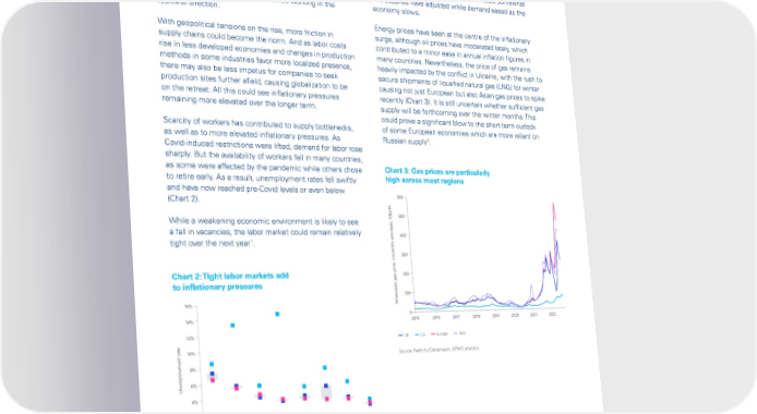 Global Economic Outlook – September 2022 Pressures on global supply chains have eased since their Although inflationary pressures were already present as peak late last year, despite the setbacks caused by the economies reopened from Covid, the invasion of Ukraine by Russia-Ukraine war. However, they remain at historically Russia added an extra strain, with a range of commodities high levels, contributing to the rise in costs experienced by exported by the region seeing their price rise significantly. many producers. While we expect the weakening in global More recently, some prices have moderated somewhat economic activity to ease the pressure on supply chains and supplies have adjusted while demand eased as the in the short term, other factors could be working in the economy slows. opposite direction. Energy prices have been at the centre of the inflationary With geopolitical tensions on the rise, more friction in surge, although oil prices have moderated lately, which supply chains could become the norm. And as labor costs contributed to a minor ease in annual inflation figures in rise in less developed economies and changes in production many countries. Nevertheless, the price of gas remains methods in some industries favor more localized presence, heavily impacted by the conflict in Ukraine, with the rush to there may also be less impetus for companies to seek secure shipments of liquefied natural gas (LNG) for winter production sites further afield, causing globalization to be causing not just European but also Asian gas prices to spike on the retreat. All this could see inflationary pressures recently (Chart 3). It is still uncertain whether sufficient gas remaining more elevated over the longer term. supply will be forthcoming over the winter months. This could prove a significant blow to the short-term outlook Scarcity of workers has contributed to supply bottlenecks, of some European economies which are more reliant on as well as to more elevated inflationary pressures. As 2 Russian supply . Covid-induced restrictions were lifted, demand for labor rose sharply. But the availability of workers fell in many countries, as some were affected by the pandemic while others chose Chart 3: Gas prices are particularly to retire early. As a result, unemployment rates fell swiftly high across most regions and have now reached pre-Covid levels or even below (Chart 2). 600 While a weakening economic environment is likely to see 500 a fall in vacancies, the labor market could remain relatively 400 1 tight over the next year . 300 Chart 2: Tight labor markets add as price (monthly average), GBp/th200 to inflationary pressures 100 16% Wholesale g 14% 0 2015 2016 2017 2018 2019 2020 2021 2022 12% UK US Europe Asia 10% Source: Refinitiv Datastream, KPMG analysis. 8% 6% Unemployment rate 4% 2% 0% Eurozone Canada Switzerland US UK Australia Mexico Japan Pre-COVID COVID peak Latest Source: OECD, KPMG analysis. 1 See KPMG’s detailed forecasts for unemployment rates in the Appendix. 2 See our European country analysis for potential implications of lower gas supply in different economies. © 2022 Copyright owned by one or more of the KPMG International entities. KPMG International entities provide no services to clients. All rights reserved. 5