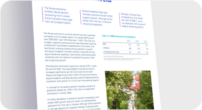Global Economic Outlook – September 2022 Switzerland: Resilient, but not immune to shocks The Swiss economy Accommodative fiscal and Strength of Swiss Franc exhibits robust growth, monetary policies should further increased by a first-mover recovering from a lower support growth, although some rate hike of SNB in June – Covid-induced output gap offset from the war in Ukraine no substantial risk to growth than its European peers. should be expected. despite softening exports. The Swiss economy is currently performing well, especially Table 15: KPMG forecasts for Switzerland compared to its European peers. Cumulative GDP growth 2021 2022 2023 over 2020-2021 was 1.6% (Germany: -1.6%). This was due to agile, supportive policies and the general global upswing. GDP 4.2 2.5 1. 2 Employment has already surpassed pre-crisis levels, with Inflation 0.5 2.9 1. 8 key factors including ongoing strong pandemic support and accommodative monetary policies. Especially strong Unemployment rate 5.1 4.3 4.2 export dynamics (watches, instruments, pharmaceuticals), Source: Eurostat, SECO, KPMG forecasts. combined with low levels of non-performing loans, have Note: Average % change on previous calendar year except for unemployment rate, also supported growth. which is average annual rate. Inflation measure used is the HICP. The economy continued to grow by a robust 0.3% in both Q1 and Q2 2022. The value added to the service sector increased significantly as the Covid restrictions were lifted at the beginning of April. Within the service industry, accommodation and food services was the fastest-growing sub-sector with growth of 12.4% from the previous quarter. In contrast to the positive growth impulses, exports of goods fell sharply by 11.5% in Q2, due to a significant contraction in transit trade. A further slowdown in economic growth is expected, with overall 2022 growth rate still robust, but dampened by spillovers from the war in Ukraine. Although direct exposure to the war (exports to impacted markets, financial sector, investment) appears limited, indirect effects (higher energy and commodity prices, supply disruptions, and lower regional and global growth) could be substantial. Fiscal and monetary policies remain supportive (despite a surprising Swiss National Bank (SNB) rate hike in June), and higher household savings during Covid should support private consumption as a stabilizer of growth. We expect GDP growth of 2.5% in 2022. © 2022 Copyright owned by one or more of the KPMG International entities. KPMG International entities provide no services to clients. All rights reserved. 43