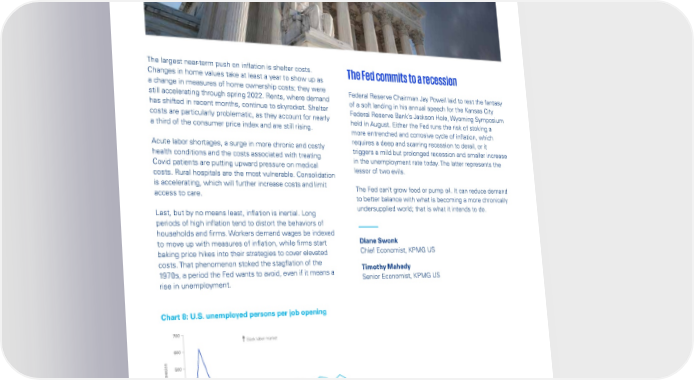 Global Economic Outlook – September 2022 The largest near-term push on inflation is shelter costs. The Fed commits to a recession Changes in home values take at least a year to show up as a change in measures of home ownership costs; they were Federal Reserve Chairman Jay Powell laid to rest the fantasy still accelerating through spring 2022. Rents, where demand of a soft landing in his annual speech for the Kansas City has shifted in recent months, continue to skyrocket. Shelter Federal Reserve Bank’s Jackson Hole, Wyoming Symposium costs are particularly problematic, as they account for nearly held in August. Either the Fed runs the risk of stoking a a third of the consumer price index and are still rising. more entrenched and corrosive cycle of inflation, which Acute labor shortages, a surge in more chronic and costly requires a deep and scarring recession to derail, or it health conditions and the costs associated with treating triggers a mild but prolonged recession and smaller increase Covid patients are putting upward pressure on medical in the unemployment rate today. The latter represents the costs. Rural hospitals are the most vulnerable. Consolidation lessor of two evils. is accelerating, which will further increase costs and limit The Fed can’t grow food or pump oil. It can reduce demand access to care. to better balance with what is becoming a more chronically Last, but by no means least, inflation is inertial. Long undersupplied world; that is what it intends to do. periods of high inflation tend to distort the behaviors of households and firms. Workers demand wages be indexed to move up with measures of inflation, while firms start Diane Swonk baking price hikes into their strategies to cover elevated Chief Economist, KPMG US costs. That phenomenon stoked the stagflation of the Timothy Mahedy 1970s, a period the Fed wants to avoid, even if it means a Senior Economist, KPMG US rise in unemployment. Chart 8: U.S. unemployed persons per job opening 700 Slack labor market 600 500 t of recession400 0 = star300 0 200 Index, 1 100 Tight labor market 0 2 4 6 8 10 12 14 16 18 20 22 24 Months since start of recession 2001 recession 2008 recession 2020 recession Source: KPMG Economics, Bureau of Labor Statistics. © 2022 Copyright owned by one or more of the KPMG International entities. KPMG International entities provide no services to clients. All rights reserved. 9