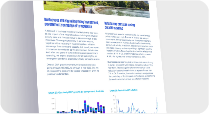 Global Economic Outlook – September 2022 Businesses still signalling rising investment, Inflationary pressure easing government spending set to moderate but still elevated A rebound in business investment is likely in the near term, Oil prices have eased in recent months, but overall energy as the impact of the recent floods on building construction prices remain very high. The war in Ukraine has also put activity ease and firms continue to take advantage of tax pressure on food prices globally and those pressures have incentives. The ongoing recovery in services exports, been exacerbated in Australia due to the floods disrupting together with a recovery in inward migration, will also agricultural activity. In addition, escalating construction costs encourage firms to expand capacity. But overall, we expect and rising housing rents are providing a significant boost to momentum to moderate as the environment deteriorates. headline inflation. Taken together the headline inflation rate And after two years of outsized increases in government reached 6.1% in Q2, and trimmed mean inflation rose to spending, we expect expenditure to fall back slightly, as 4.9%, the highest rate for each series since 1991. emergency pandemic expenditure finally comes to an end. Businesses are reporting that purchase cost are continuing Overall, GDP growth momentum is expected to ease to surge, consistent with inflation increasing further in the going through H2 2022, to a trough in mid-2023. But we near term. The ending of the Government’s fuel excise still expect the economy to escape a recession, given its reduction is set to boost inflation to a peak of more than positive fundamentals. 7% in Q4. Thereafter, the modest easing in energy prices, the unwinding of flood impacts on food price, and softening demand momentum should see inflation moderate. Chart 27: Quarterly GDP growth by component, Australia Chart 28: Australia’s CPI inflation 7.5% 7% 5.0% 6% 5% 2.5% 4% 0% 3% ercent hange, y/y P -2.5% % c 2% -5.0% 1% -7.5% 0% -10.0% -1% Q1 Q2 Q3 Q4 Q1 Q2 Q3 Q4 Q1 Q2 Q3 Q4 Q1 Q2 Q3 Q4 Q1 Q2 2000 2002 2004 2006 2008 2010 2012 2014 2016 2018 2020 2022 2018 2019 2020 2021 2022 Household consumption Government spending Change in inventories GDP Headline Trimmed mean Private investment Net exports Statistical discrepancy Source: KPMG Economics, Australian Bureau of Statistics, Macrobond. Source: KPMG Economics, Australian Bureau of Statistics, Macrobond. © 2022 Copyright owned by one or more of the KPMG International entities. KPMG International entities provide no services to clients. All rights reserved. 29