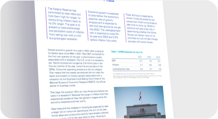 Global Economic Outlook – September 2022 United States: Economy poised to stall The Federal Reserve has Economic growth is expected Fiscal stimulus is expected to committed to raise rates and to slow below the economy’s remain limited as pandemic aid hold them high for longer, to potential rate of growth, wanes and infrastructure projects slowly bring inflation back to employment is expected to take time to ramp up. Midterm its 2% target. The goal is to stall and lose ground as we get elections will play a key role in prevent a more entrenched into 2023. The unemployment determining whether the White and persistent cycle of inflation rate is expected to cross 5% House can deliver more on its from taking root with a mild by year-end 2023 and 5.5% promises to curb climate change but prolonged recession. before inflation fully cools. and deal with social issues. Overall economic growth hit a wall in 2022, after surging at Table 1: KPMG forecasts for the U.S. its fastest pace since1984 in 2021. Real GDP contracted for 2021 2022 2023 the first two quarters of the year; a phenomenon usually associated with a recession. The U.S. is not in a recession, GDP 5.7 1. 5 -0.1 yet. Payroll employment surged by 2.8 million jobs in the Inflation 4.7 8.2 3.8 first six months of the year, twice the annual pace of the 2010s. Consumer spending slowed but did not collapse. Unemployment rate 5.4 3.7 4.3 That means that the losses we endured did not meet the Source: KPMG Economics, Bureau of Economic Analysis, Bureau of Labor Statistics. depth and breadth of losses typically associated with a Note: Forecasts are dated as of September 2, 2022. GDP and inflation are year-over-year % change. recession by the Business Cycle Dating Committee of the The unemployment rate is an annual average. Numbers are percentages. National Bureau of Economic Research (NBER), the official arbiter of business cycles. That begs the question: Why do most Americans believe we were in a recession? Because the surge in inflation that they experienced eroded all they had gained in wages since the economy reopened and then some. Rate hikes and the collapse in housing are expected to take a larger toll on consumer spending by the turn of the year. Home sales and construction activity have already cratered; housing prices will be the next shoe to drop. Housing is one of the single largest triggers to additional consumer spending; now, it is working in reverse. Business investment is expected to contract after playing catch-up to supply chain delays over the summer. Spending on structures and equipment will be hardest hit. Spending on intellectual property, automation and cyber security is expected to remain buoyant. © 2022 Copyright owned by one or more of the KPMG International entities. KPMG International entities provide no services to clients. All rights reserved. 7