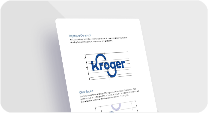 CONFIDENTIAL Kroger Brand Guidelines - For approved Kroger vendor use only 4 Logotype Construct The updated logo is carefully constructed to maintain ownable characteristics while allowing for perfect legibility at any size, on any application. Clear Space To ensure the optimum legibility of the logo, we need to protect its perimeter. Clear space is equal to the height of the âKâ curve, as shown. Do not place other logos, type or graphic elements within the clear space indicated in the diagram.