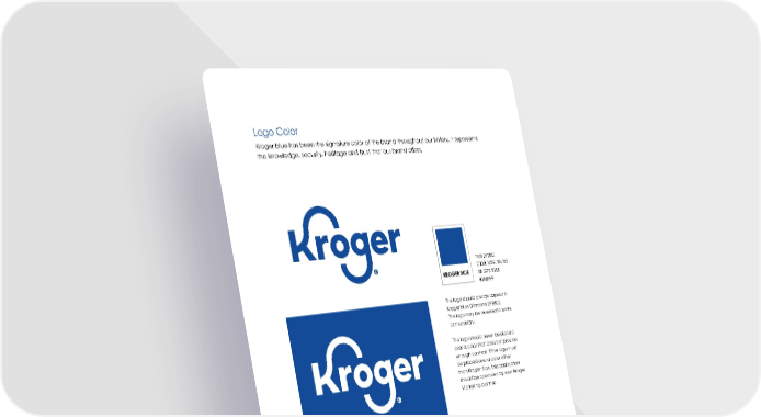 CONFIDENTIAL Kroger Brand Guidelines - For approved Kroger vendor use only 6 Kroger Logo Used for all vendor-owned and Kroger communications. The logo should always appear in Kroger blue (Pantone 2728C). The logo may be reversed in white as necessary. The logo should never be placed over a color that does not provide enough contrast. If the logo must be placed over a color other than Kroger Blue, this application should be approved by your Kroger Marketing partner. PMS 2728C C100, M82, Y6, K0 R8 G73 B153 #084999 KROGER BLUE Logo Color Kroger blue has been the signature color of the brand throughout our history. It represents the knowledge, security, heritage and trust that our brand offers.