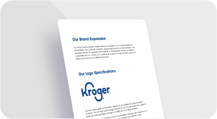 CONFIDENTIAL Kroger Brand Guidelines - For approved Kroger vendor use only 3 Our Brand Expression As a brand whose goal is to make freshness accessible to all, our brand expression should reflect that goal with a friendly, approachable and uncomplicated look, tone and feel. We are the opposite of the highfalutin’ foodie brand. Instead, our brand is a relatable and witty friend who understands our lives and our personality quirks and offers us solutions we actually like and need. Our new visual identity is the perfect synergy of our contemporary brand’s present and past. The new logotype is designed based on what Kroger needs today, while still retaining the recognizable and signature ligatures of the original version. Because of the logo’s impact on customer perceptions of Kroger, strict adherence to the established specifications is necessary to maintain the consistency of its appearance and usage. Reproduction of the Kroger logo must always be done using Corporate-approved artwork. The logo may not be redrawn, changed or distorted and cannot be reproduced using conventional type faces. The Registered Trademark symbol ® is incorporated into the design of the Kroger logo, in the correct position and size that is appropriate for most applications. However, if the Kroger logo is greatly increased or decreased in size, the ® registration declaration should be scaled accordingly. Our Logo Specifications