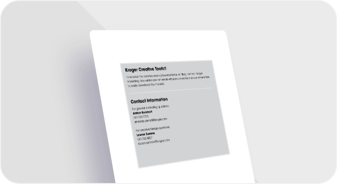 CONFIDENTIAL Kroger Brand Guidelines - For approved Kroger vendor use only 11 Kroger Creative Toolkit To receive the creative assets (downloadable art files), contact Kroger Marketing. You will be sent an email with instructions for a secure Internet link to easily download this material. Contact Information For general marketing questions: Amber Burkhart 513-762-7075 [email protected] For creative/design questions: Lauren Summe 513-762-4837 [email protected]