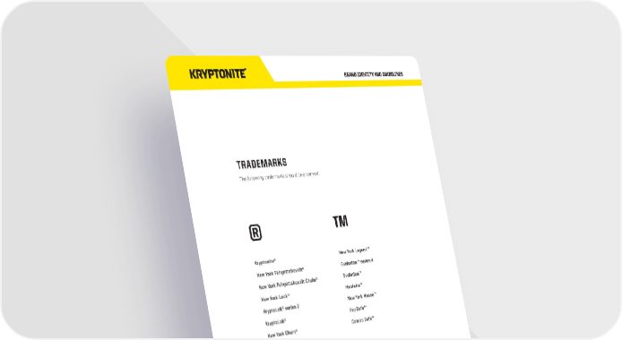 BRAND IDENTITY AND GUIDELINES PACKAGING ELEMENTS • 29 TRADEMARKS The following trademarks should be observed: ® Kryptonite® New York Fahgettaboudit® New York Fahgettaboudit Chain® New York Lock® KryptoLok® series 2 KryptoLok® New York Chain® New York Disc Lock® KryptoFlex® ™ New York Legend™ Evolution™ series 4 Evolution™ Hardwire™ New York Noose™ Key Safe™ Combo Safe™