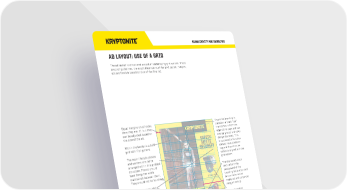 BRAND IDENTITY AND GUIDELINES ADS • 33 KRYPTONITELOCK.COM SAFETY MEETS SECURITY STREET F-135 AVENUE R-14 Equal margins on all sides. Here they are .5”, but they can be adjusted based on the size of the ad. Within the border is a 6x12 grid with 12pt gutters. The main lifestyle photos and content should be arranged within this gridded structure. Photos should have the gutter width maintained between them. They should not be touching. Pencil elements add emphasis. AD LAYOUT: USE OF A GRID The ad layout is structured around an underlaying grid system. These are just guidelines, the exact dimensions of the grid, gutter, margins, etc are flexible based on size of the final ad. Kryptonite branding is placed on a black “tab” that comes in from the edge of the page and can overlap photos and other design elements. This is supposed to function almost like a sticker or tag and should not be perfectly aligned with the grid system. The distressed black texture from the background of the branding tab is also used for a smaller social media tab and corporate Allegion lockup. Clipped product photography is placed directly on the textured yellow background with a very light drop shadow to help it stand out. These elements are loosely placed based on the structural grid, but should be adjusted so that they are generally horizontally centered within the yellow space.