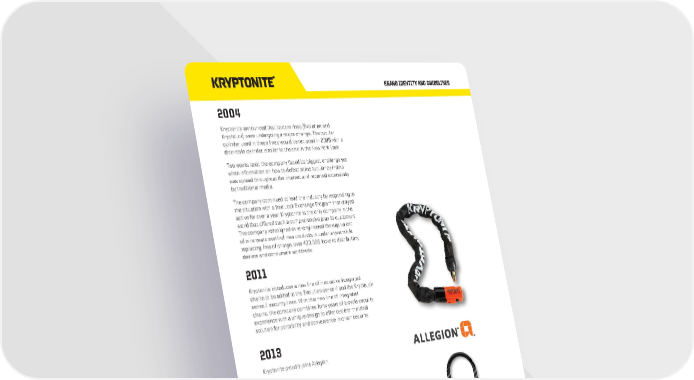 BRAND IDENTITY AND GUIDELINES BRAND BUILDING BLOCKS • 5 2004 Kryptonite announced that its core lines (Evolution and KryptoLok) were undergoing a major change. The tubular cylinder used in these lines would be replaced in 2005 with a disc-style cylinder, similar to the one in the New York Lock. Two weeks later, the company faced its biggest challenge yet when information on how to defeat some tubular cylinders was spread throughout the internet and reported extensively by traditional media. The company continued to lead the industry by responding to the situation with a free Lock Exchange Program that stayed active for over a year. Kryptonite is the only company in the world that offered such a comprehensive plan to customers. The company redesigned or re-engineered the equivalent of nine years worth of new products in under a year while replacing, free of charge, over 400,000 locks to distributors, dealers and consumers worldwide. 2011 Kryptonite introduces a new line of innovative integrated chains to be added to the Evolution series 4 and the KryptoLok series 2 security lines. With this new line of integrated chains, the company combines forty years of bicycle security experience with a unique design to offer cyclists the ideal solution for portability and convenience in chain security. 2013 Kryptonite proudly joins Allegion. 2014 Kryptonite puts together a team of some of the great NYC messenger minds to help us with the development of the Messenger Collection. From initial brainstorming to concept selection through product testing and even packaging design, the Messengers had majority rule—every step of the way. 2016 In pursuit of industry leadership in both safety and security of the cyclist, Kryptonite releases a full range of high powered, high quality bicycle light solutions, helping the rider to both see, and be seen.
