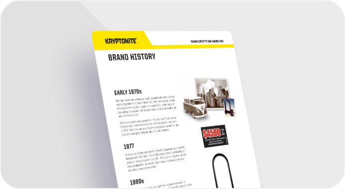 BRAND IDENTITY AND GUIDELINES BRAND BUILDING BLOCKS • 4 EARLY 1970 s Michael Zane was a free-spirited, bearded kid with a VW van and a big idea for a new kind of lock. He traveled thousands of miles showing the unique U-shaped locking device and spreading his passion for bicycle security to bike dealers all around the country. With production assistance from his father, Ernest, and a $1,500 cash investment, Kryptonite Corporation was born in 1972. Not only was a company started, but an entire new industry category, bicycle security, was created. 1977 Kryptonite introduced the Anti-Theft Guarantee on it’s newly developed K-4 U-lock. If a thief steals a bike by defeating our product, we will pay for the bike. This iconic program has set the standard for the Action Sport security category and is copied by many companies. 1980 s The K-4 U-lock revolutionized the industry and was the inspiration for most every bicycle u-lock on the market today. It was celebrated globally: Was placed in the New York Museum of Modern Art permanent design collection in 1983. The only bicycle accessory company in history to win Japan’s coveted Good Design Prize in 1988 Captured Germany’s Museum of Utilitarian Art Award in 1988. 1994 Kryptonite returned to the streets of the Big Apple to test its latest innovation - The New York Lock. The lock confounded bike thieves in a historic street test which was publicized in the New York Post. The New York Lock has become the flagship lock for the company and was the original item in what has become its premier line. BRAND HISTORY