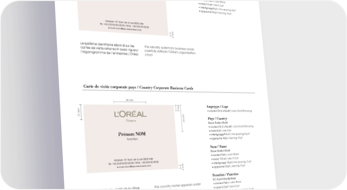 ›‹›EŠEšIE † STˆT ‰‡Š‹ Carte de isite grope / Corporate Business Cards „ mm Logotype / Logo ƒ mm • couleur Or à chaud † color Gold Stamping Adresse / Address IŠC ‹ ant Œarde ‡ooŽ • couleur ˆoir † color ‡lacŽ • corps ƒƒ pt † size 5,5 pt • interlignage ‚ pt † line spacing 8 pt • approche ‰„ pt † Kerning 10 pt ‹dresse “ ˆ° ˆom de la rue „„„„ •ille Šel. – „€„ „„ „„ „„ „„ † —ob. – „€„ „„ „„ „„ e“mail˜ nom™ser ice.loreal.com mm Le système identitaire décliné sur les The identit‚ s‚stem for €siness cards cartes de isite retranscrit a ec rigueur carefll‚ reflects l’réal’s organization l’organigramme de l’entreprise L’Oréal. chart Carte de isite corporate pays / Country Corporate Business Cards „ mm Logotype / Logo ƒ mm • couleur Or à chaud † color Gold Stamping ‰ mm France mm Pays / Country ‡auer ‡odoni ‡old • couleur Or à chaud † color Gold Stamping Prénom NOM • corps ‚ pt † size 8 pt • interlignage ž‘ pt † line spacing Œ,6 pt ’onction • approche ‰„ pt † Kerning 10 pt Nom / Name ‡auer ‡odoni ‡old ‹dresse “ ˆ° ˆom de la rue „„„„ •ille • couleur ˆoir † color Black Šel. – „€„ „„ „„ „„ „„ † —ob. – „€„ „„ „„ „„ • corps ‰‰ƒ pt † size 11,5 pt e“mail˜ nom™ser ice.loreal.com • interlignage ‰ pt † line spacing 13 pt mm • approche ‰„ pt † Kerning 10 pt Fonction / Function IŠC ‹ ant Œarde ‡ooŽ šègle générale ˜ l’intitulé du ›ays The contr‚ name appears nder • couleur ˆoir † color ‡lacŽ accompagne le Logotype L’Oréal the ’réal ogo • corps ‘ƒ pt † size 6,5 pt • interlignage ‰„ pt † line spacing 10 pt • approche ‰„ pt † Kerning 10 pt Adresse / Address IŠC ‹ ant Œarde ‡ooŽ • couleur ˆoir † color ‡lacŽ • corps ƒƒ pt † size 5,5 pt • interlignage ‚ pt † line spacing 8 pt • approche ‰„ pt † Kerning 10 pt L’Oréal _Charte graphique/ 29