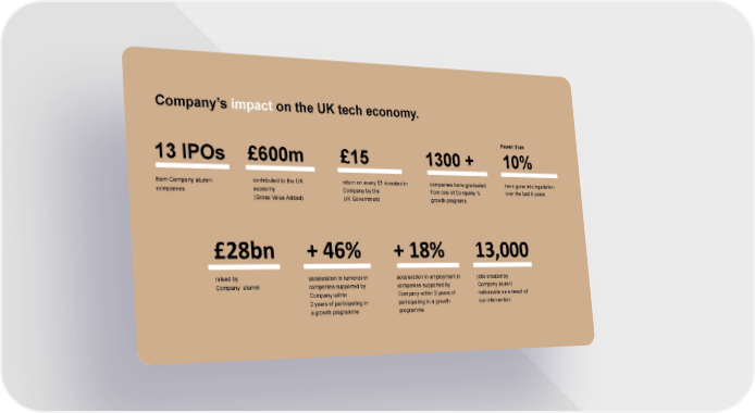 &RPSDQ\¶VLPSDFWRQWKH8.WHFKHFRQRP\ )HZHUWKDQ …P … ,32V KDYHJRQHLQWROLTXLGDWLRQ FRQWULEXWHGWRWKH8. UHWXUQRQHYHU\…LQYHVWHGLQ FRPSDQLHVKDYHJUDGXDWHG IURP&RPSDQ\DOXPQL RYHUWKHODVW\HDUV HFRQRP\ &RPSDQ\E\WKH IURPRQHRI&RPSDQ\µV FRPSDQLHV *URVV9DOXH$GGHG 8.*RYHUQPHQW JURZWKSURJUDPV ¼ÃÉD[ ÛÅÇÚ ÛÂÉÚ ÂÄÁÁÁ UDLVHGE\ DFFHOHUDWLRQLQHPSOR\PHQWLQ DFFHOHUDWLRQLQWXUQRYHULQ MREVFUHDWHGE\ &RPSDQ\DOXPQL FRPSDQLHVVXSSRUWHGE\ FRPSDQLHVVXSSRUWHGE\ &RPSDQ\DOXPQL &RPSDQ\ZLWKLQ\HDUVRI &RPSDQ\ZLWKLQ QDWLRQZLGHDVDUHVXOWRI SDUWLFLSDWLQJLQDJURZWK \HDUVRISDUWLFLSDWLQJLQ RXULQWHUYHQWLRQ SURJUDPPH DJURZWKSURJUDPPH