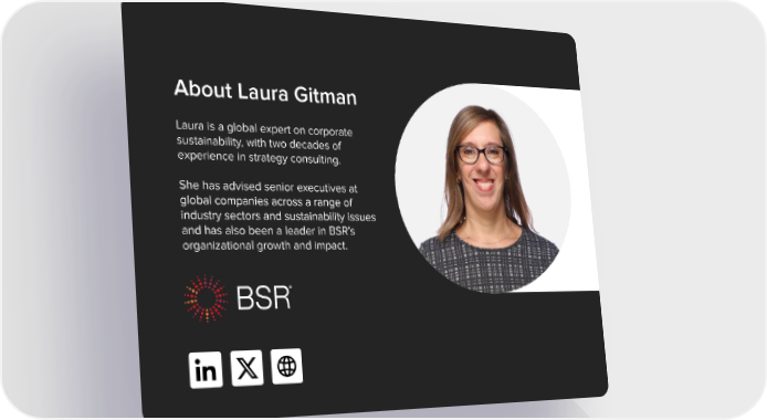 About Laura Gitman Laura is a global expert on corporate sustainability, with two decades of experience in strategy consulting. She has advised senior executives at global companies across a range of industry sectors and sustainability issues and has also been a leader in BSR’s organizational growth and impact.