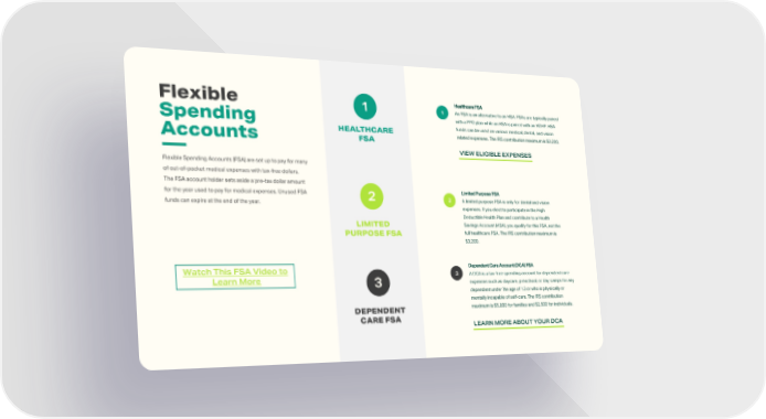 Flexible 1 Healthcare FSA 1 An FSA is an alternative to an HSA. FSAs are typically paired Spending with a PPO plan while an HSA is paired with an HDHP. HSA HEALTHCARE funds can be used on various medical, dental, and vision Accounts FSA related expenses. The IRS contribution maximum is $3,200. VIEW ELIGIBLE EXPENSES Flexible Spending Accounts (FSA) are set up to pay for many of out-of-pocket medical expenses with tax-free dollars. The FSA account holder sets aside a pre-tax dollar amount Limited Purpose FSA for the year used to pay for medical expenses. Unused FSA 2 2 A limited purpose FSA is only for dental and vision funds can expire at the end of the year. expenses. If you elect to participate in the High Deductible Health Plan and contribute to a Health LIMITED Savings Account (HSA), you qualify for this FSA, not the PURPOSE FSA full healthcare FSA. The IRS contribution maximum is $3,200. Watch This FSA Video to 3 Dependent Care Account (DCA) FSA Learn More A DCA is a tax-free spending account for dependent care 3 expenses such as daycare, preschool, or day camps for any dependent under the age of 13 or who is physically or mentally incapable of self-care. The IRS contribution DEPENDENT maximum is $5,000 for families and $2,500 for individuals. CARE FSA LEARN MORE ABOUT YOUR DCA