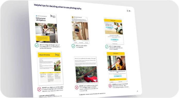 —elpful tips for deciding when to use photography use to bring warth and a sense of use to counicate use to engage potential storytelling when counicating about our capabilities custoers and support the tone products and benefits. of a counication. ¢Š use to lighten or add decoration ¢Š use to explain coplex content ¢Š use to support transactional to instructional clais related aterials. as it could trigger negative eotions. inforation to custoers. „hose ©ot featuring iagery is a better choice. ‰nstead use illustration which allows for touchpoints generally have no iagery. ore specificity. Liberty Mutual brand guidelines GRM U.S. section—September 2020 (Version 2.3) Confidential—Internal use only—Content not for reproduction ”Ÿ