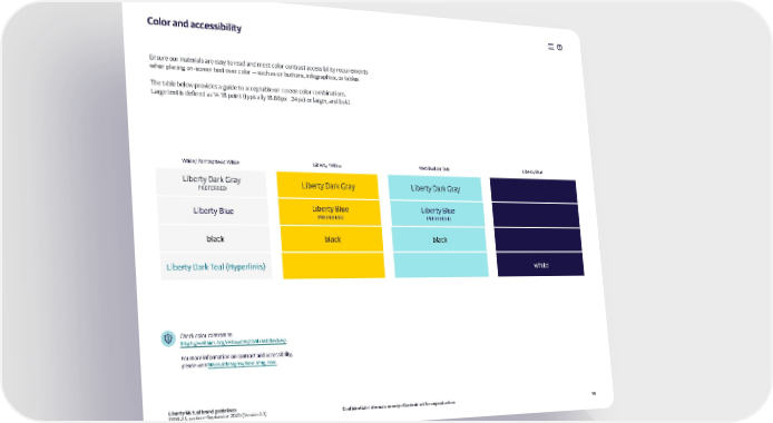 Color and accessi„ility Ensure our aterials are easy to read and eet color contrast accessibility re™uireents when placing onŸscreen text over color — such as on buttons infographics or tables. „he table below provides a guide to acceptable onŸscreen color cobinations. Large text is defined as ƒŽŸƒ point (typically ƒ.‚‚px Ÿ 2Žpx) or larger and bold. £hite¦ tospheric £hite Liberty ¢ellow £eb …utton „eal Liberty …lue Liberty ar ‡ray Liberty ar ‡ray Liberty ar ‡ray ›¬E†E¬¬E Liberty …lue Liberty …lue Liberty …lue ›¬E†E¬¬E ›¬E†E¬¬E blac blac blac Liberty ar „eal (ˆyperlin s) white €hec color contrast at° https°¦¦webai.org¦resources¦contrastchec er¦. †or ore inforation on contrast and accessibility please visit https°¦¦designsyste.lig.co. Liberty Mutual brand guidelines GRM U.S. section—September 2020 (Version 2.3) Confidential—Internal use only—Content not for reproduction … ™