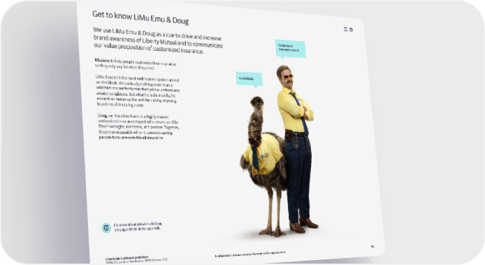 ‡et to now LiMu Eu oug £e use LiMu Eu oug as a cue to drive and increase Customi¦ed brand awareness of Liber ty Mutual and to counicate insurance expert. our value proposition of custoižed insurance. ission¥ to help people custoiže their insurance so they only pay for what they need. † wild „ird. LiMu Eu isn’t the ost wellŸtrained spo es anial on the bloc . ˆe’s actually nothing ore than a wild bird in a perfectly starched yellow unifor and aviator sunglasses. …ut what he lac s in s ills he ore than a es up for with his catchy rhying brandŸrecallŸinducing nae. oug on the other hand is a highly trained custoižed insurance expert who serves as LiMu Eu’s wrangler translator and partner. „ogether they’re unstoppable when it coes to saving people fro oneŸsižeŸfitsŸall insurance. †or ore about LiMu Eu oug see pages Ÿ‘ in the appendix. Liberty Mutual brand guidelines GRM U.S. section—September 2020 (Version 2.3) Confidential—Internal use only—Content not for reproduction 3 ™
