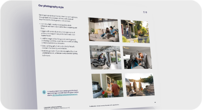 Our photography style Our imagery projects an honest, down-to-earth optimism. It’s a glimpse into a moment of time, with a natural imperfection that feels genuine, not contrived. • Lean into a light, mostly neutral palette which enhances our brand colors rather than competing with them. • Images with a natural, unretouched appearance of yellow or teal support our palette but should never appear forced. • Look for images whose foreground, middle ground, and background help create dimension without falling victim to messiness or distraction. • Source photography that meets Liberty Mutual’s standards for diversity and inclusion. • Avoid images taken from extreme angles, that show unsafe behaviors, or feature overly dramatic lighting techniques. To request a contact sheet containing all of the brand approved images on Brand SharePoint, please send an email to [email protected]. Liberty Mutual brand guidelines GRM U.S. section—September 2020 (Version 2.3) Confidential—Internal use only—Content not for reproduction 48