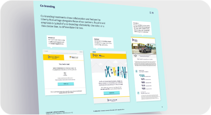 Coƒ„randing €oŸbranding treatents show collaboration and feature the Exception Liberty Mutual logo alongside those of our partners. E™ual brand †or soe partners we ay need to be color neutral. ‰n soe instances ephasis is typical of a coŸbranding relationship. ¡se color or a the logos can be separated with a thin divider line to differentiate the two. oneŸpixel gray rule or positioned further away fro each other. referred ptional ¡se our brand color to help œoeties coŸbranding re™uire create brand separation in exceptions to usage cases as in a coŸbranded applications. sponsorship partnership. RSVP now Quote now Liberty Mutual brand guidelines GRM U.S. section—September 2020 (Version 2.3) Confidential—Internal use only—Content not for reproduction … …