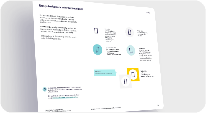 Using a background color with our icons Our icons are all Liberty Blue and can be used with or without a circle. The circle makes the icons feel uniform, sets a friendly, accessible tone, and prompts a call-to-action. When selecting a background color for you icon, it’s No circle Grey 4 circle important to ensure the balance of color in a piece is on White and Grey 4 on White background. background. In digital Use for RTB’s and on-brand. Refer to page 29 for our color wheel. tactics, icons may also short lists. appear on a yellow Tints vary by tactic. Refer to page 33 for the correct background. recipe for building your tint. Use for long lists, and forms. Teal circles in Print Teal in DIgital Use sparingly to maintain We limit the use of this the proper percentage of style as teal icons may give teal on a piece. the appearance of being Use for CTA’s and short lists. clickable and can negatively impact user experience. Use only when needed to create a visual hierarchy. Important: White circle We don’t use icons on yellow circles. on Grey 4 or colored background. Use for RTB’s and short lists. In direct mail, it is acceptable to laser icons in black over the teal spot color in order to reduce the required number of shell versions. For questions on icon color and use per tactic, please email USCMBrandStandards@LibertyMutual.com. Liberty Mutual brand guidelines GRM U.S. section—September 2020 (Version 2.3) Confidential—Internal use only—Content not for reproduction 30